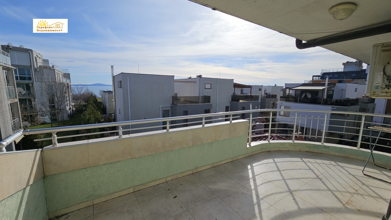 Тристаен апартамент в затворен комплекс в кв. Сарафово, гр. Бургас. Разположен на трети етаж, с площ от 106,07 кв.м. Състои се от дневна с кухня, две спални, две бани с тоалетни, коридор, две тераси, с частична гледка море.