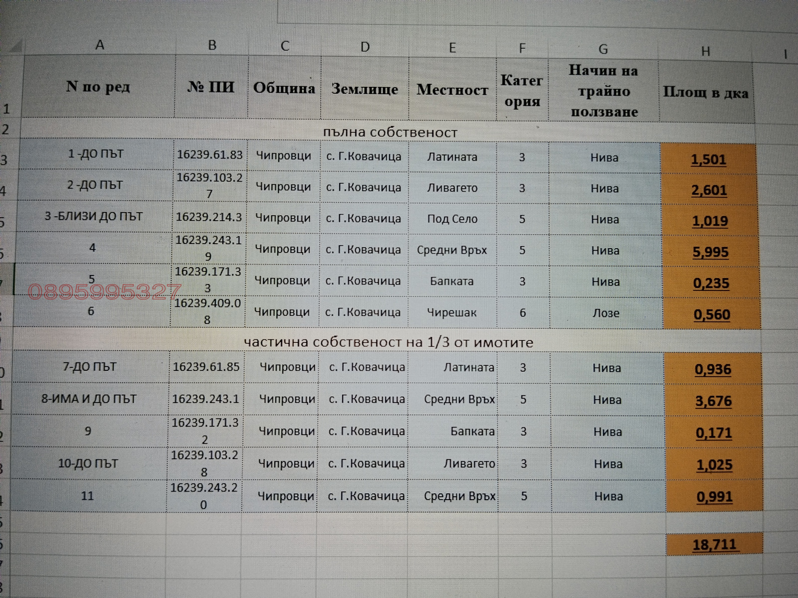 11 16239.243.20 Чипровци с. Г.Ковачица Средни Връх 5 Нива 0,991