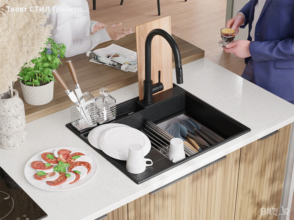 Това позволява да използвате мивката като многофункционална кухненска работна станция, която улеснява подготовката на храна и миенето на съдове.