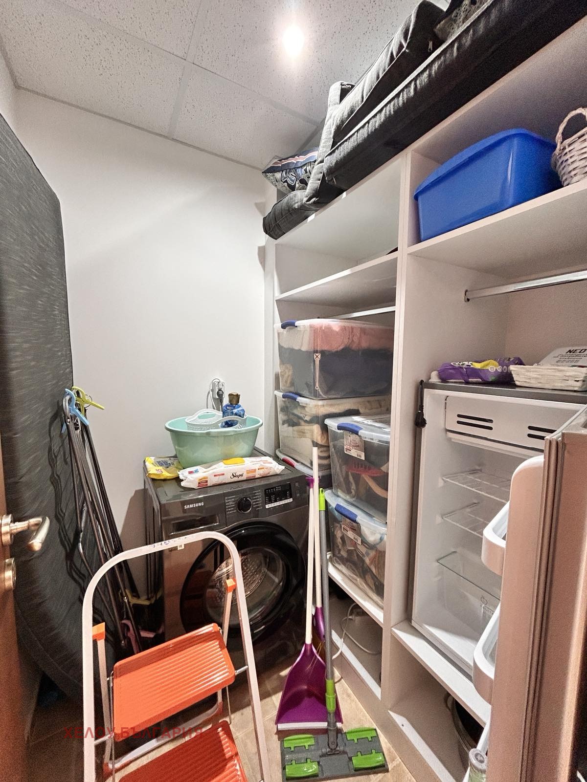 Има килер, в който е исналирана пералнята, втория хладилник, има допълнителни рафтове за сърханение, сушилка за дрехи. Баята е завършена с душ кабина. Спалнята е просторна и светла, с голям гардероб, голямо двойно легло с нощни шкафчета и лампи, тоалетка с огледало. Апартаментът е обзаведен с вкус и очаква своя нов собственик. Готови документи!