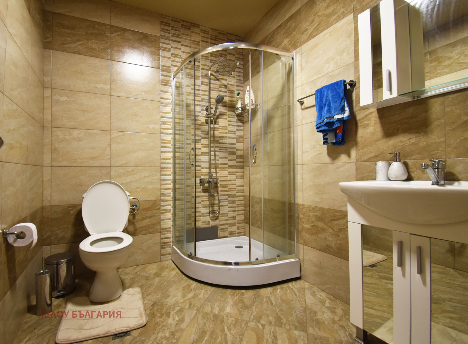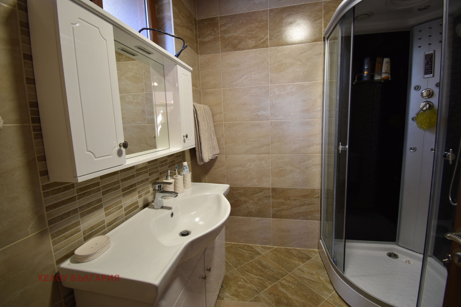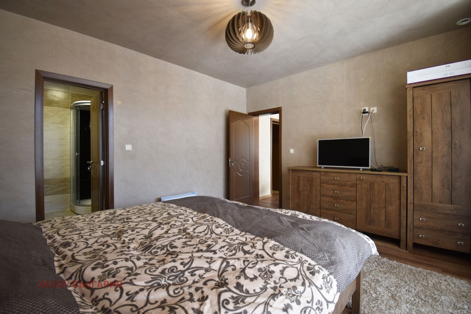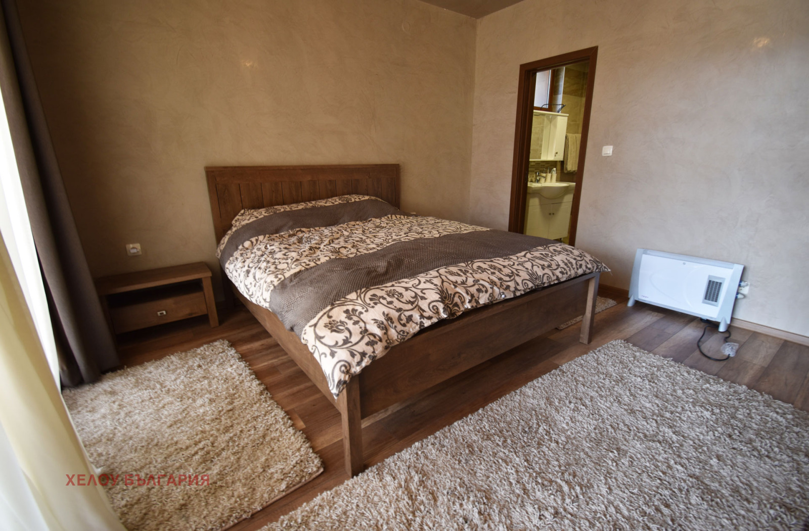 Има една преходна спалня с баня и тоалетна, завършени до най-малкия детайл, тя е обзаведена с голямо двойно легло, нощни шкафчета, скрин и гардероб. Тук има банята с душ кабина, бойлер и санитария. По коридор се достига до техническо помещение, има и сауна с баня, които са в процес на довършване. В коридора е разположена и втора баня с тоалетна за останалите помещения. От северната страна на къщата е главния вход с блиндирана екстериорна врата, антрето е завършено със скрин с огледало, закачалка и гардероб. Спалня 2 и 3 са непреходни. Спалня 2 е завършена с двойно легло, гардероб, нощни шкафчета и скрин, спалня 3 е завършена с двойно легло гардероб и скрин. Има отделна баня завършена с душ кабина и тоалетна. Под в спалните помещения е с висококачествен ламинат, стените са с латекс.
