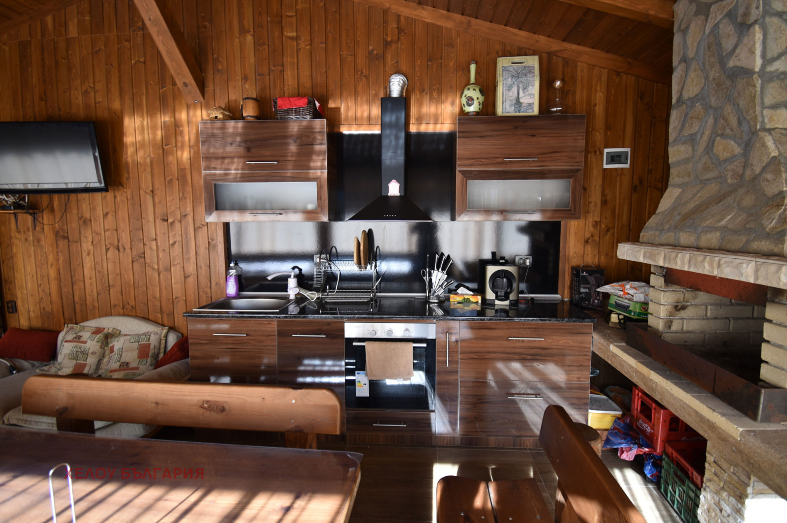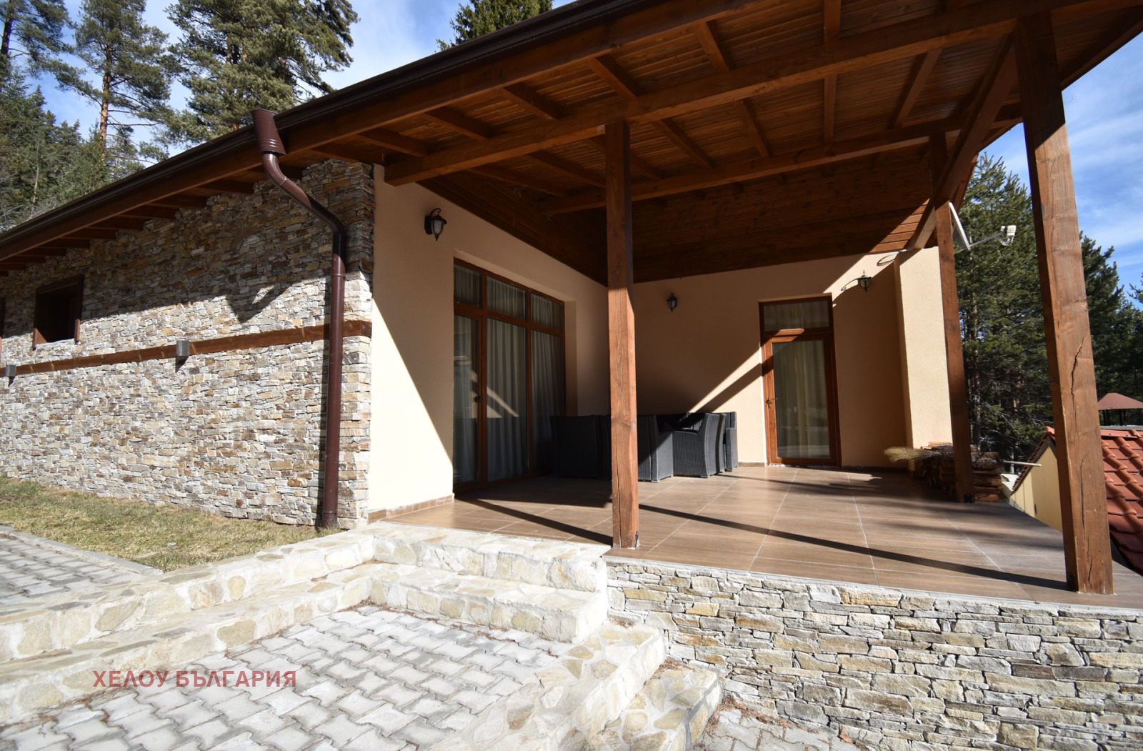 Впечатление прави архитектурата на имота. Съчетанието на естествени материали по външната част, каменна облицовка и красиви греди, оставени в естествения им цвят, голяма веранда за приятно прекарване през летните дни предполага и допълва вътрешния дизайн.