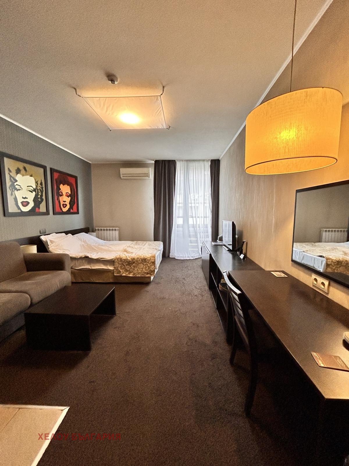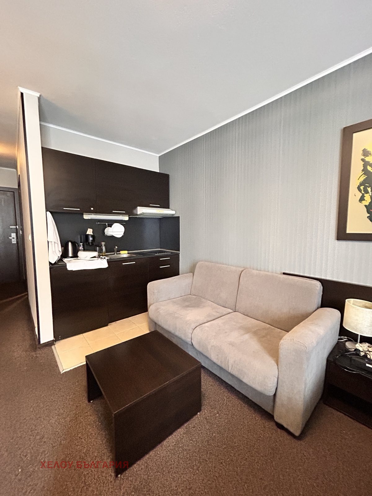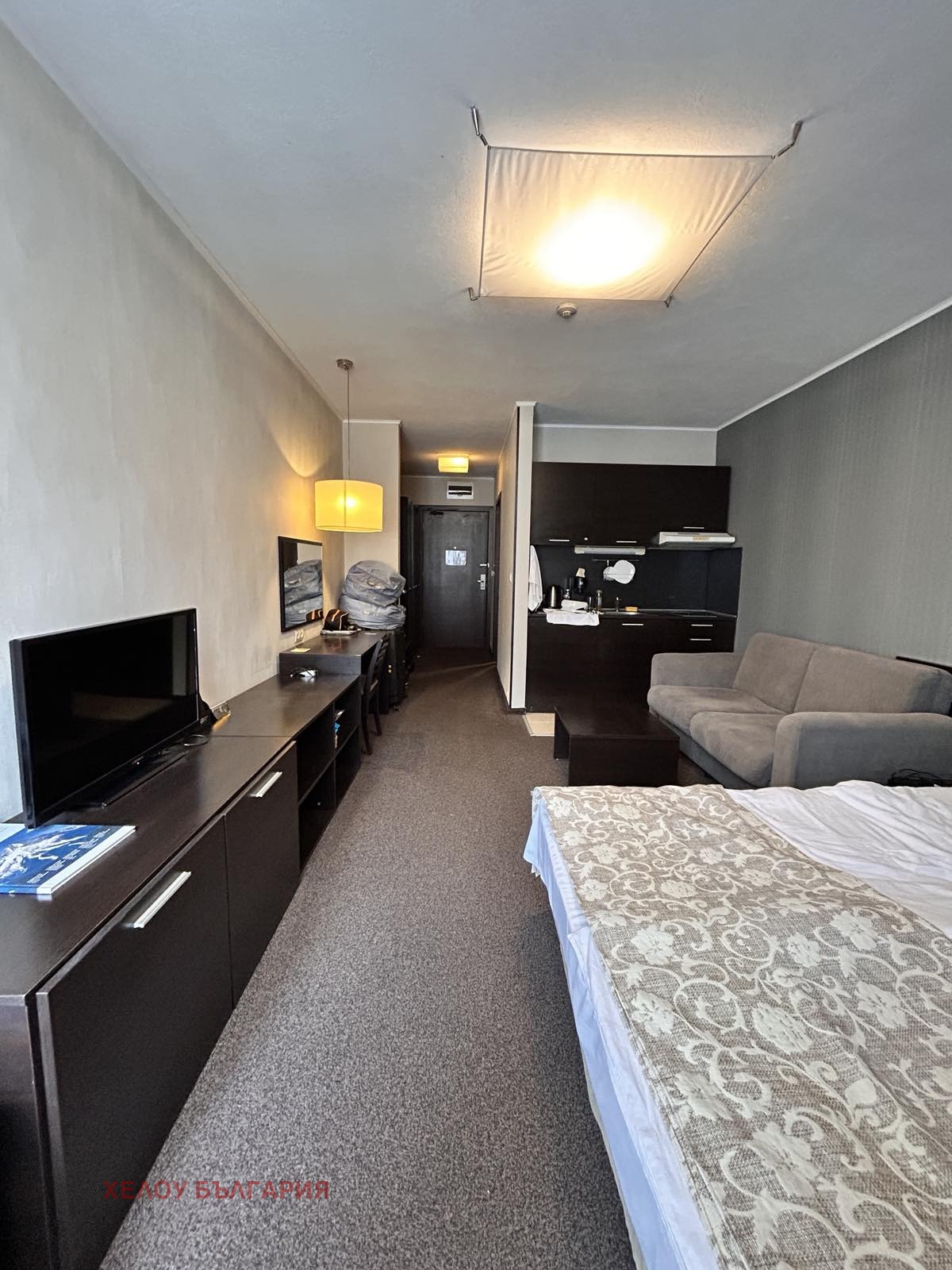 Студиото, което продаваме в хотел е с обща площ от 41.45 квадратни метра, намира се на 2-ри етаж в сградата и се състои от антре, стая и баня с вана. Aпартаментът е обзаведен със стил и качествени мебели. Кухненският бокс е оборудван с котлон, абсорбатор и хладилник. Има климатик, двойно легло, нощни шкафчета и лампи.