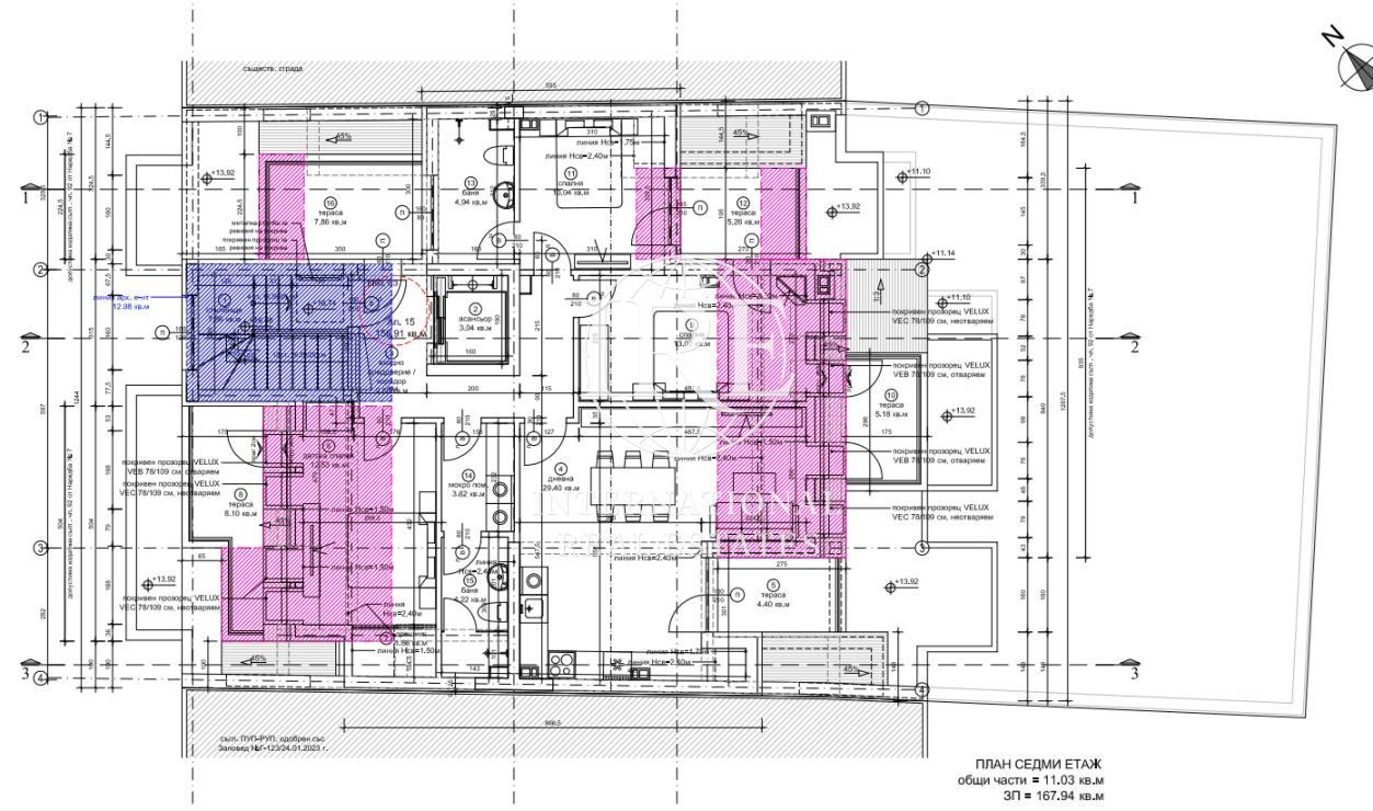 На 7-ми етаж от 7 са разположени голям дневен тракт с кухненска част, три спални, две бани с тоалетни, мокро помещение.