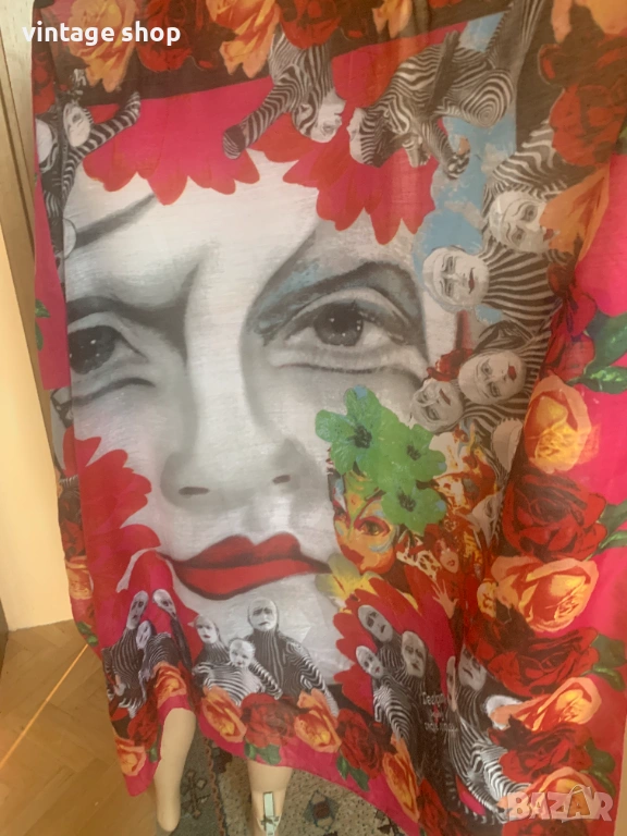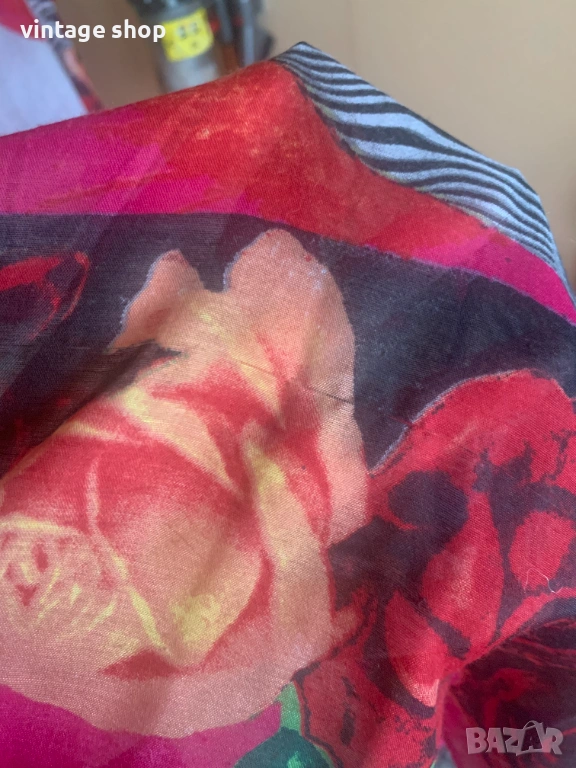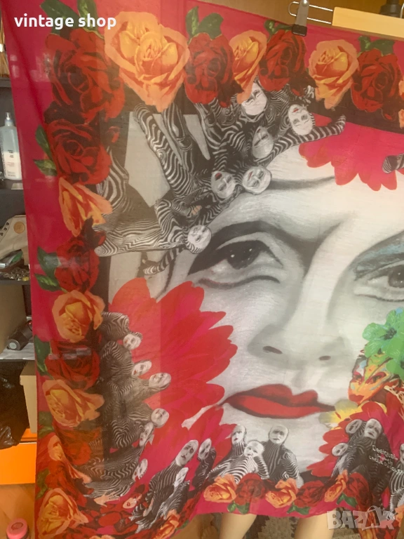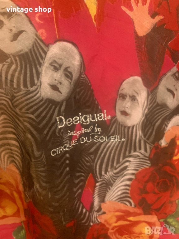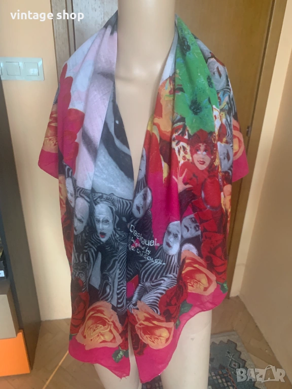 Много красив, артистичен. пъстър шал. продукт на колаборацията между Desigual i Cirque du Soleil. Палитра от цветове с преобладваща циклама. Големи, красиви рози в огненочервен и жълт цвят рамкират шала. Изображения на циркови артисти допринасят за артистичността му.
