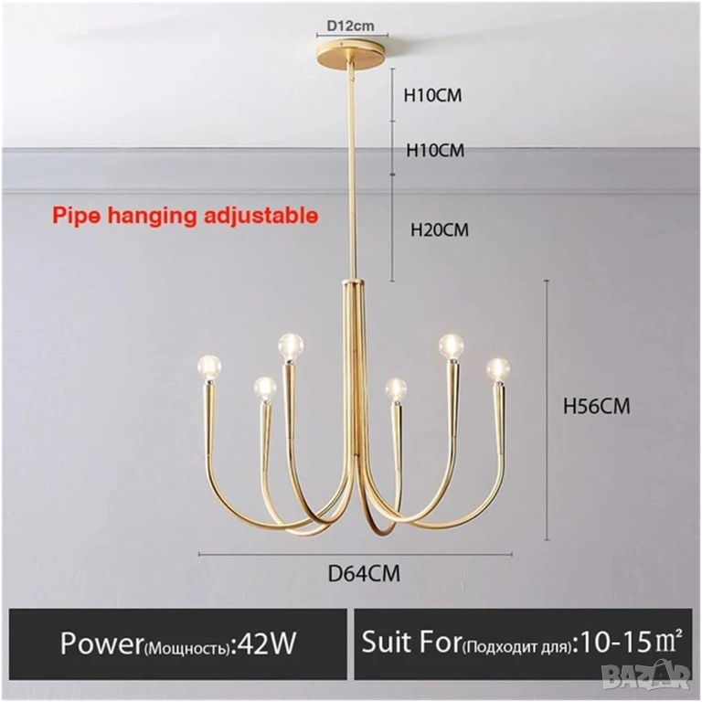 Размери на полилея: диаметър на лампата: 64 сантиметра, височина: 50 сантиметра. Височината на регулируемия стълб е 56-76 сантиметра, а стаята може да бъде декорирана чрез регулиране на височината на полилея.
