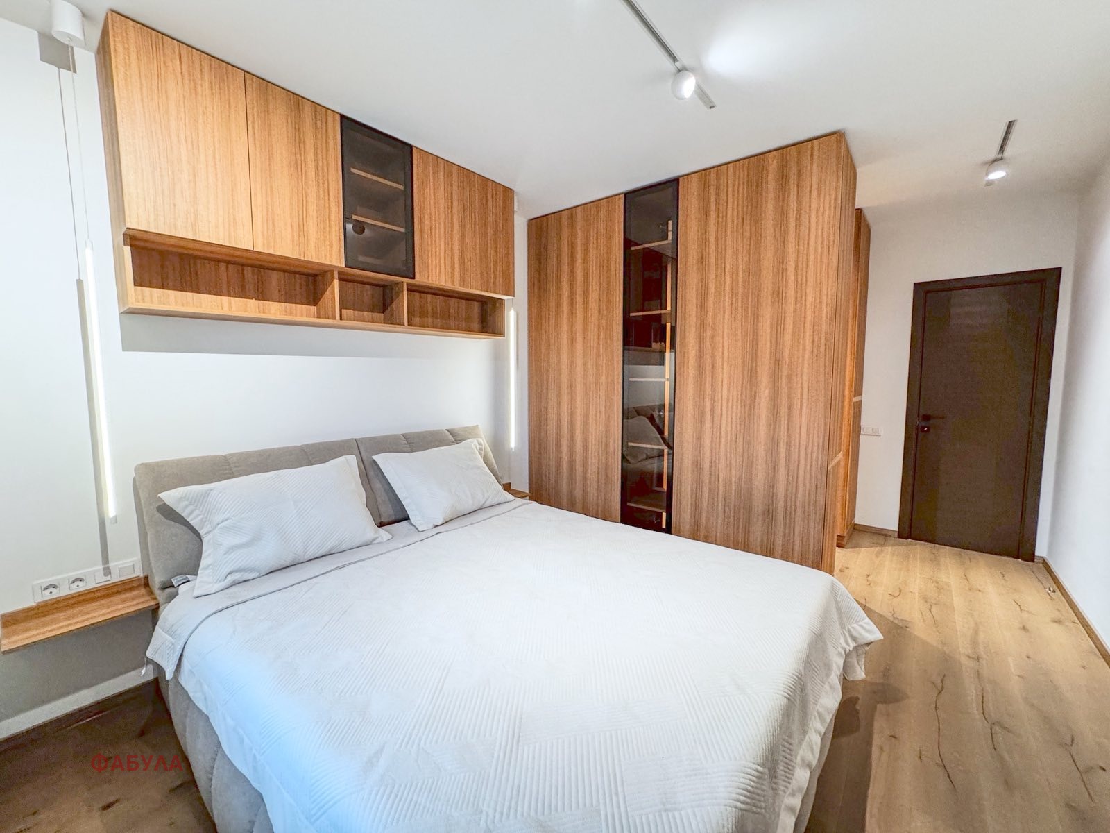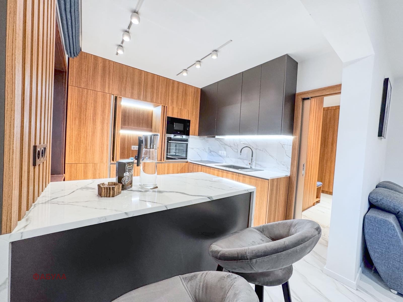 Разпределението на имота включва:антре, дневна с трапезария и напълно оборудвана кухня, две луксозно обзаведени спални, едната с прилежащ дрешник, баня с тоалетна, както и допълнителна тоалетна за гости. Разпределението е добре обмислено, светло и функционално, с отлично усвоени пространства.