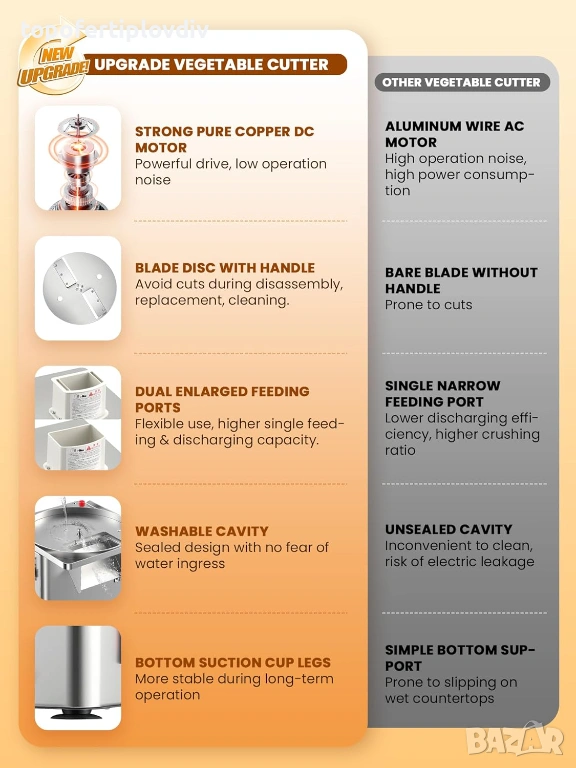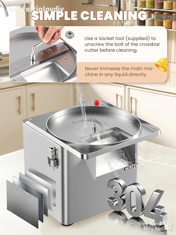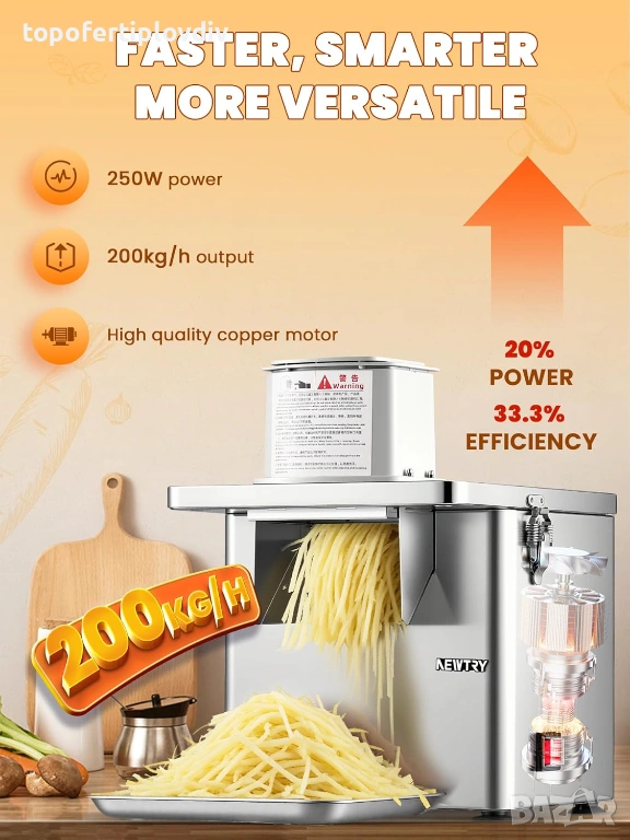 300 W изцяло меден мотор за висока производителност: многофункционалният резач за зеленчуци е оборудван с мощен 300-ватов изцяло меден мотор, който осигурява постоянна и надеждна работа дори при тежки задачи. Необходими са само 20 минути за обработка на 100 кг зеленчуци. Основата е оборудвана с вендузи, за да се гарантира стабилност по време на обработка.