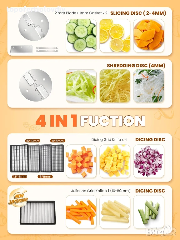 4 В 1 МНОГОФУНКЦИОНАЛЕН КУХНЕНСКИ РЕЗАЧ - Създайте своите кулинарни творения с този многофункционален резач: тънко рязане, нарязване на резени, настъргване и нарязване на кубчета, всичко в едно. Комплектът съдържа 4 ножа за кубчета (6 x 6, 8 x 8, 10 x 10, 13 x 15 мм), нож за рязане с регулируема дебелина (1-4 мм), фиксиран нож за настъргване (4 мм) за жулиен и нож за ленти (10 x 80 мм). Идеален за бързо приготвяне на вашите ястия.