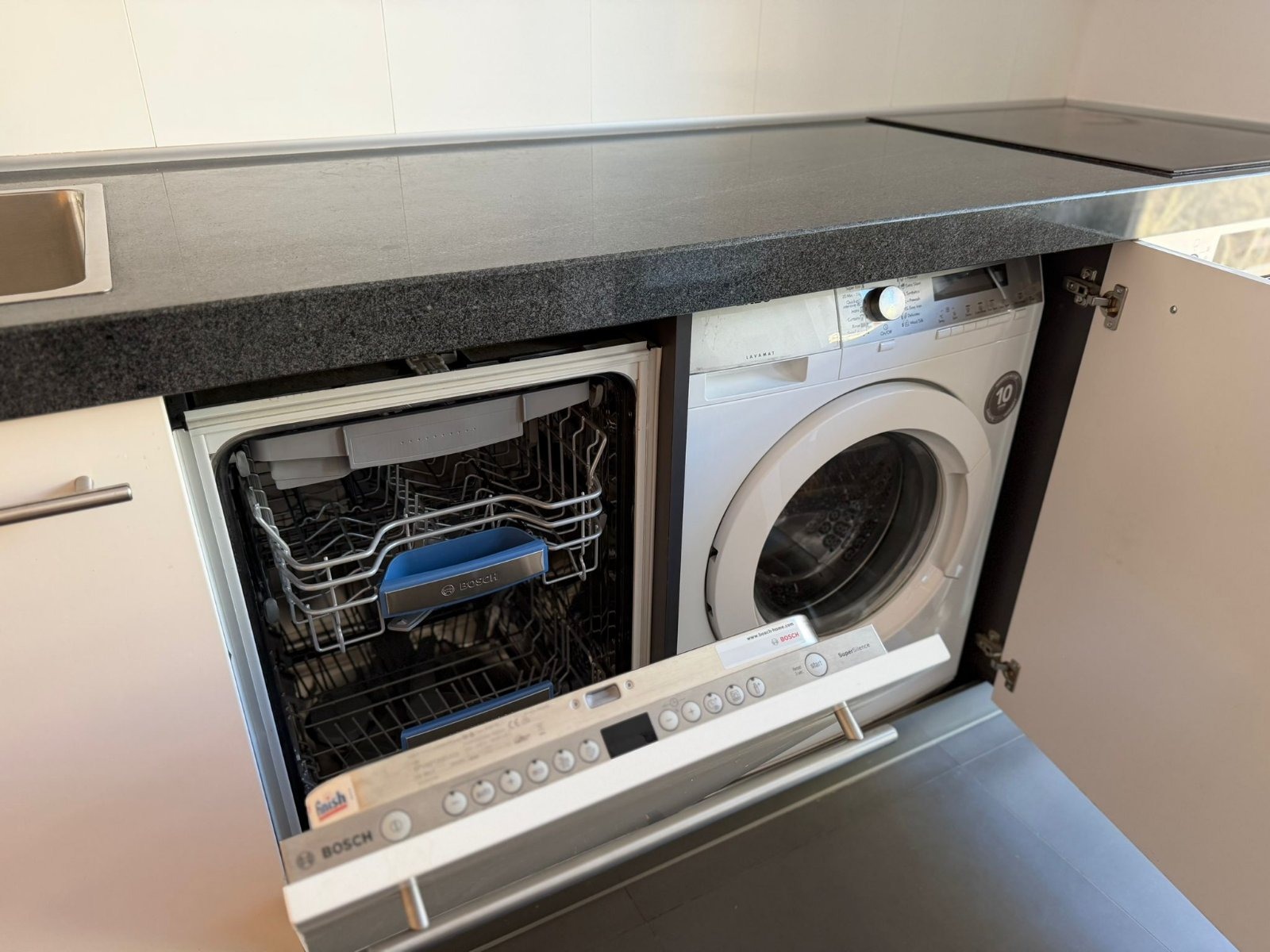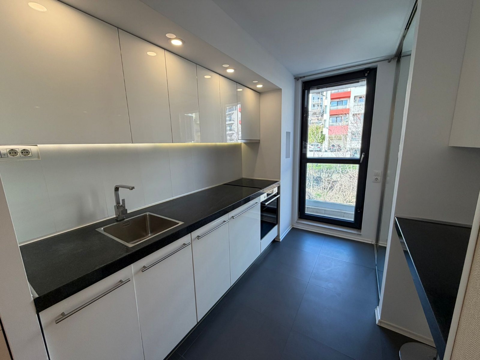 Отделена в кухненски бокс, стилно оборудвана кухня, с вградени стъклокерамичен плот и нова фурна BOSCH, съдомиялна машина BOSCH, пералня, голям вграден хладилник Liebherr с отделен фризер. От кухнята има достъп към втора малка тераса с гледка към входа и достъпа на сградата.