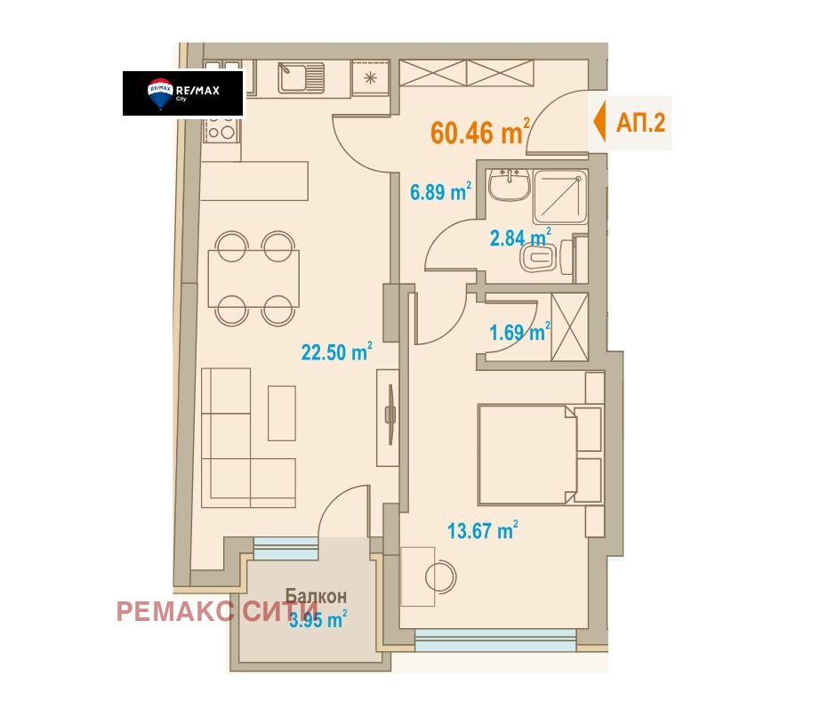 входно антре, просторна дневна с кухненски бокс и трапезария, спалня, баня с тоалетна, балкон.