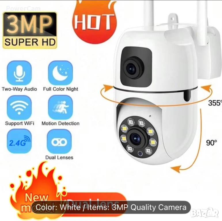🔥 3MP Dual-Lens WiFi Камера 2 в 1 – 360° Въртене | Цветно Нощно Виждане
