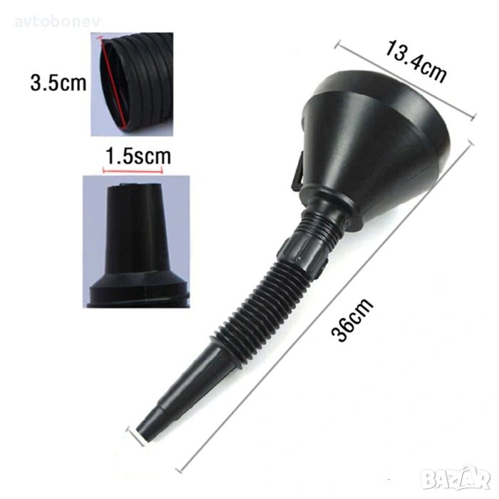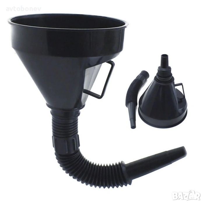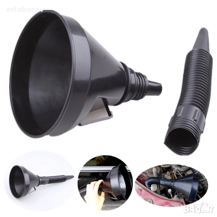 Фунията за гориво е практичен и незаменим помощник при преливане и зареждане на различни течности като бензин, дизел, масло, антифриз и други автохимикали.