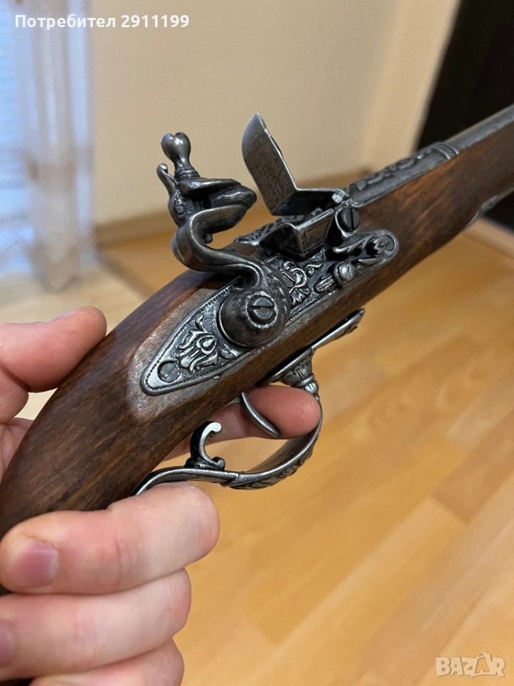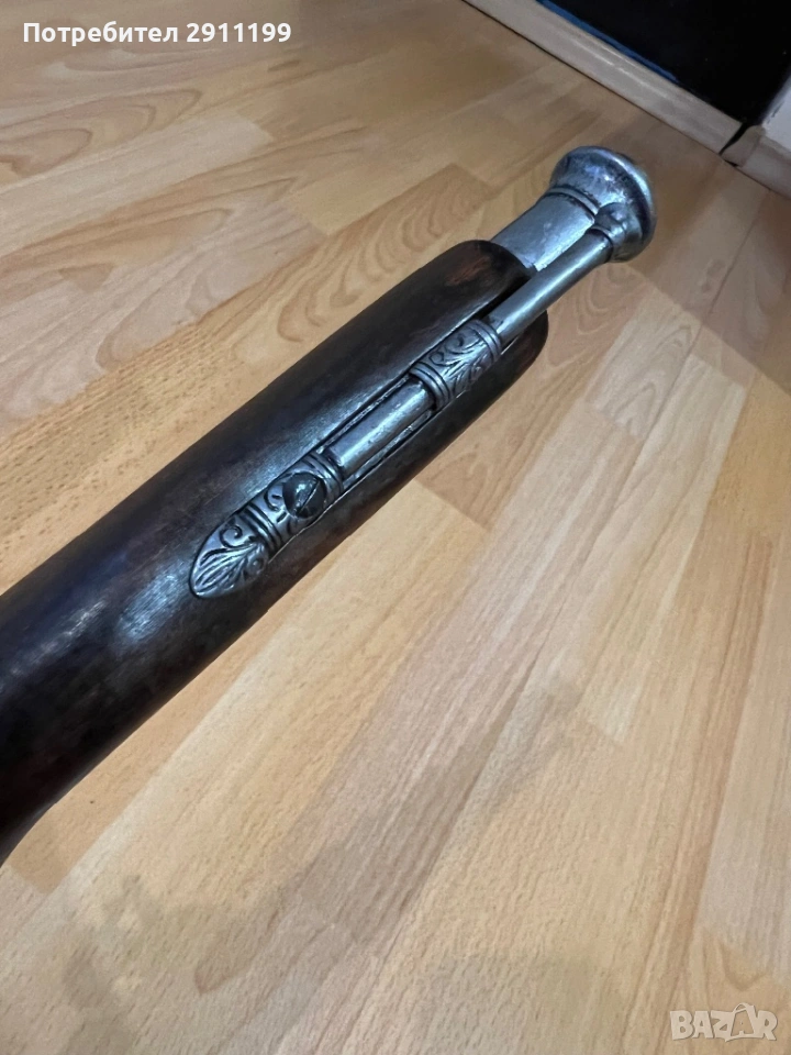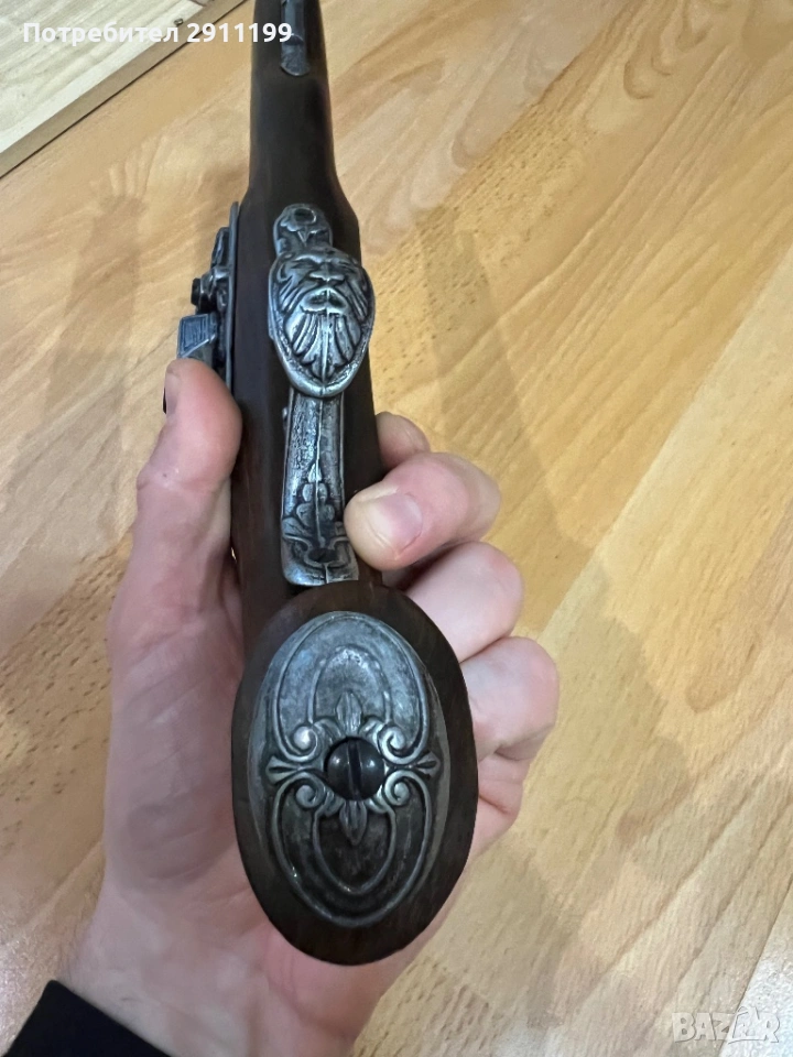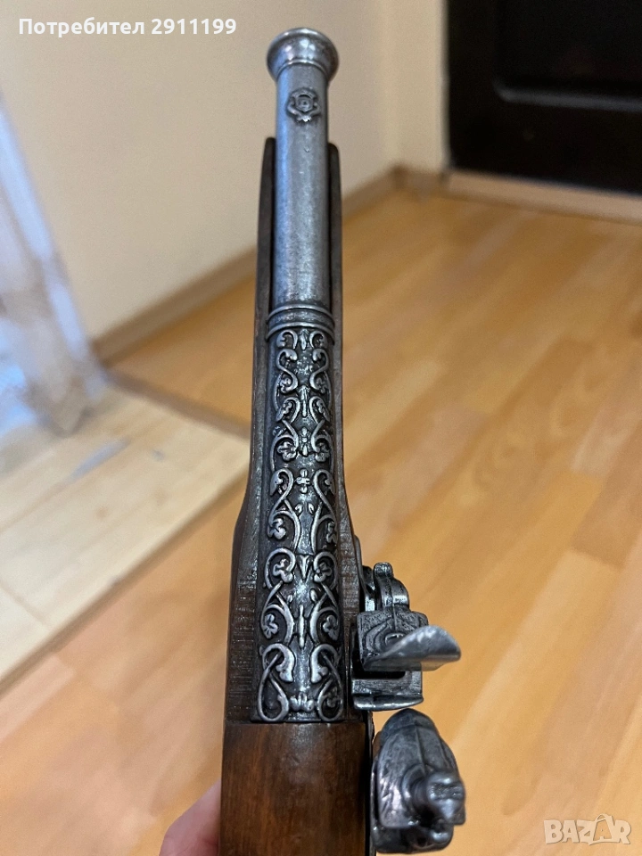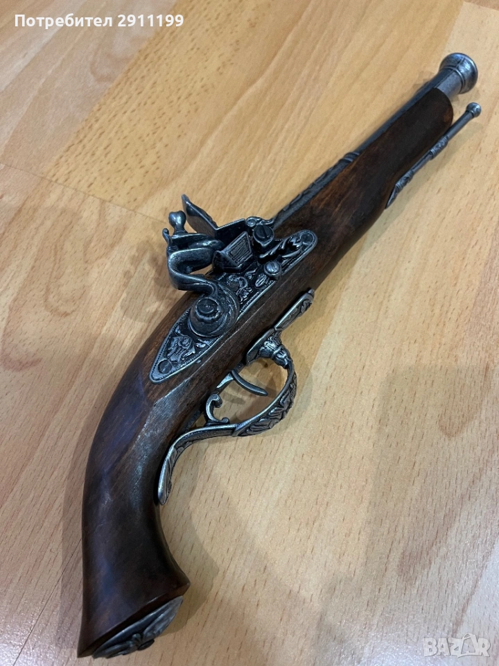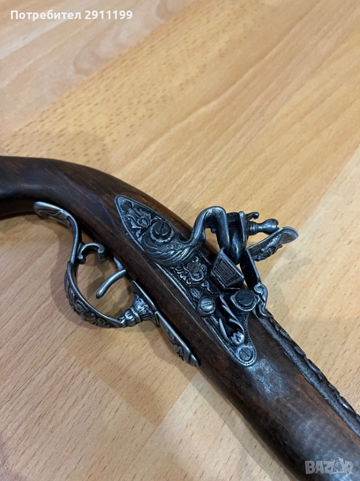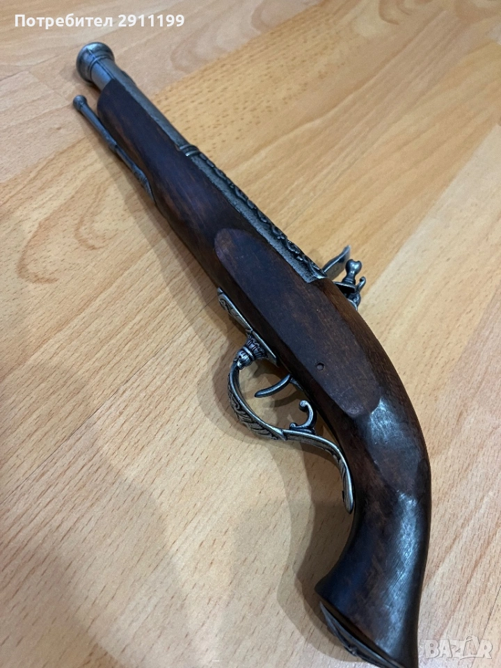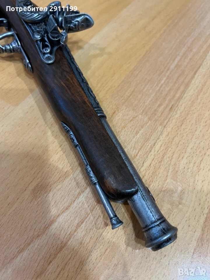 и дърво. Дълъг е 37 см. Механизма му работи.