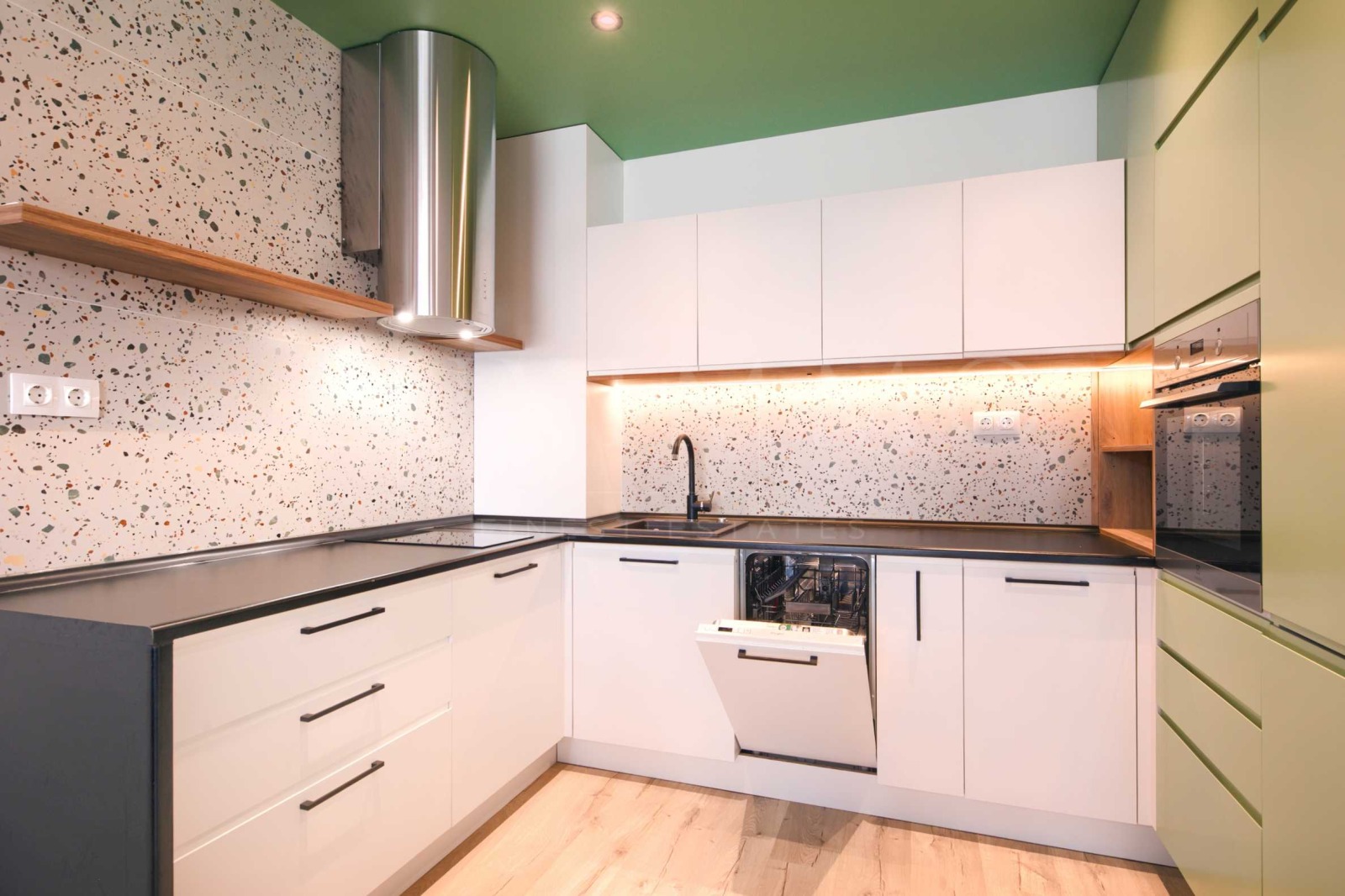 Кухнята е напълно оборудвана с вградени електроуреди, включително съдомиялна, фурна, котлони, абсорбатор и хладилник, както и практично вътрешно разпределение на шкафовете.