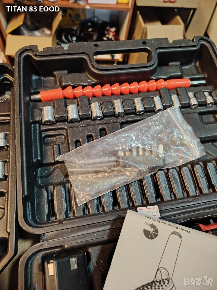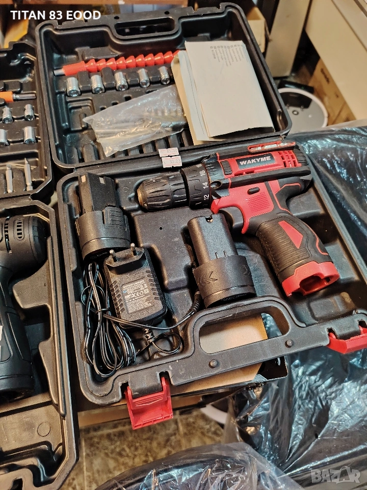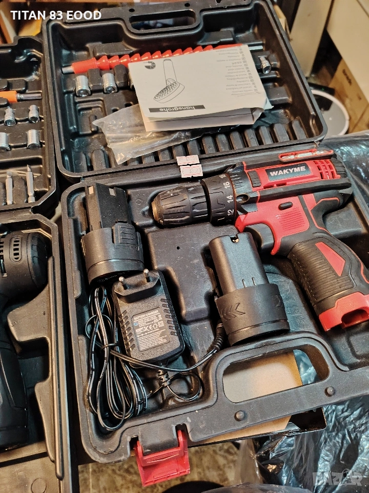 Комплект: Включва 2 литиево-йонни батерии от 1500mAh, зарядно устройство и различни накрайници/свредла.
