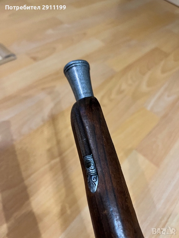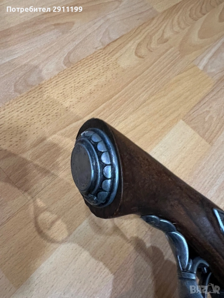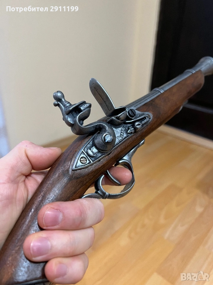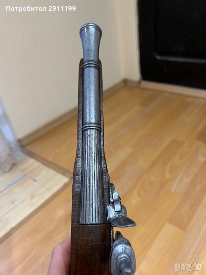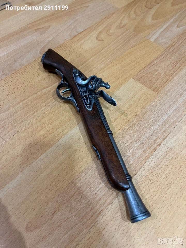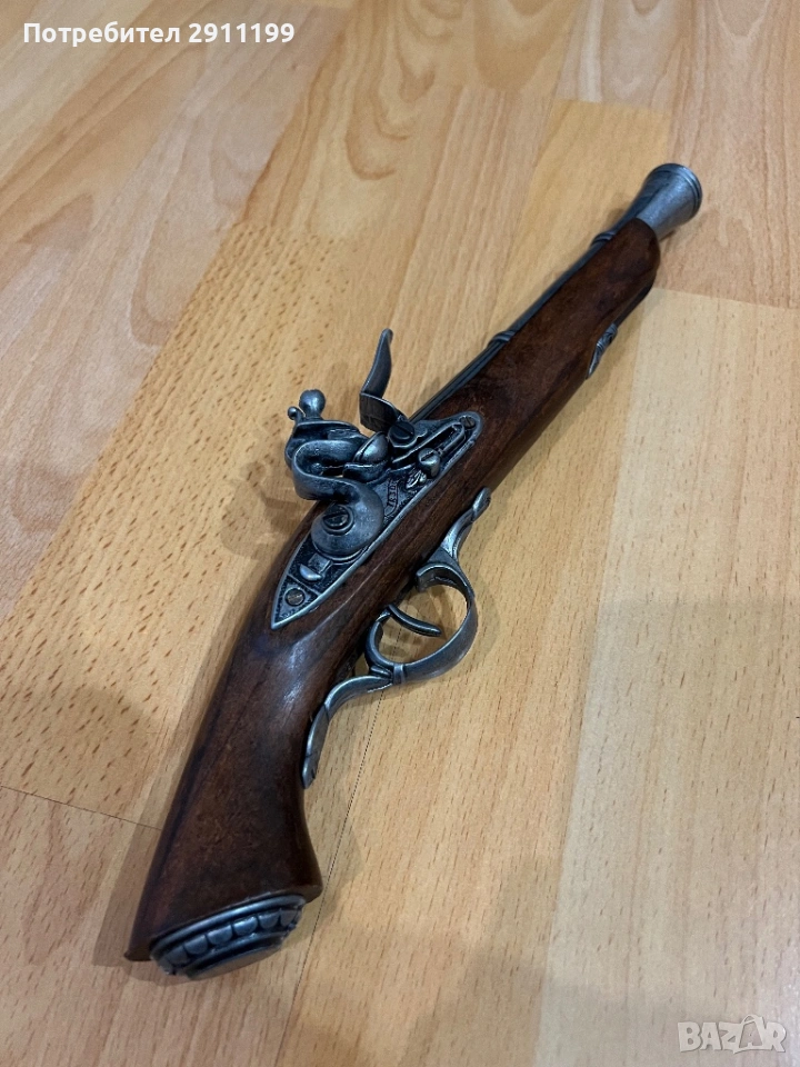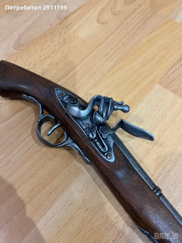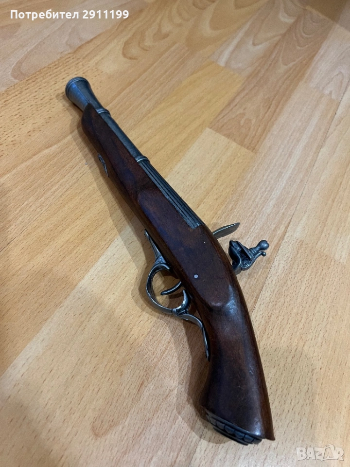 и дърво. Дълъг е 37 см. Механизма му работи.