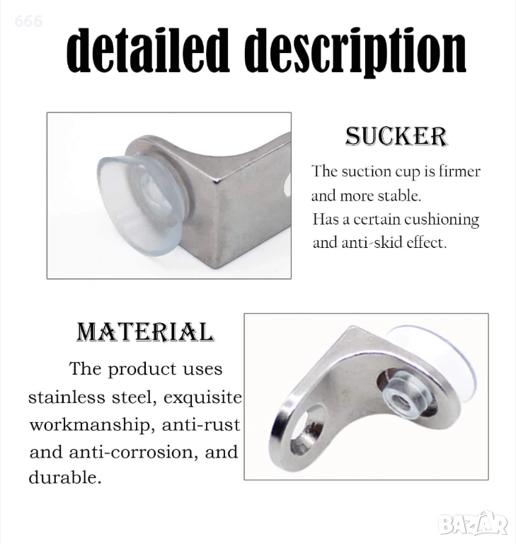 Дизайн на вендуза: дизайнът на силиконова вендуза може по-добре да защити драскотините между ламината и субстрата и няма да остави следи върху ламината, а функцията против приплъзване на вендузата се абсорбира по-добре от ламината, за да се предотврати подхлъзване. Лесен за използване: повърхността на ламинираната опора от цинкова сплав е полирана, така че е гладка и няма да пореже ръцете ви и е лесна за инсталиране.