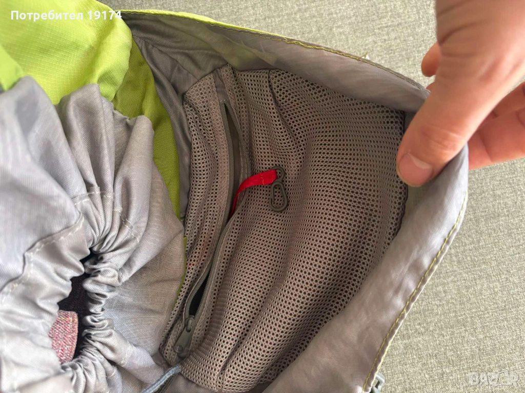 Има ситема за пиене на вода, джоб за бутилка, капак с два джоба вътрешен и външен, покрривало за дъжд - червено чисто ново, както и специален джоб за него.