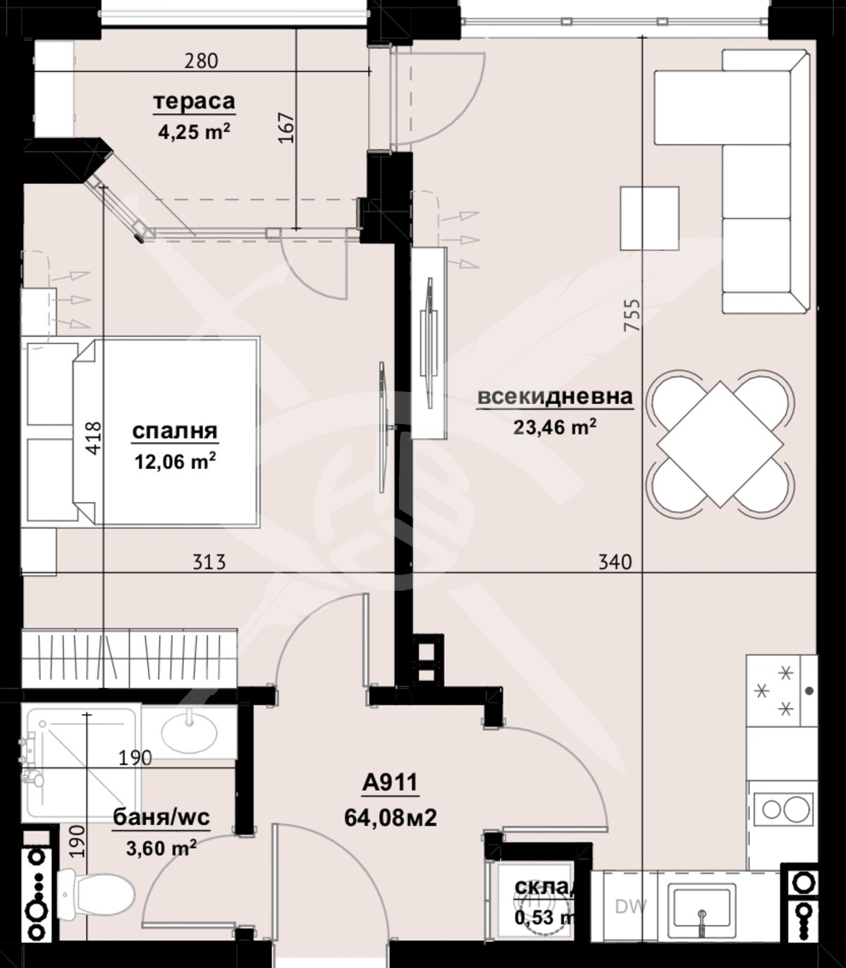 РАЗПРЕДЕЛЕНИЕ: Жилището разполага с площ 64,08 кв.м., състои се от хол с кухня, спалня и баня с тоалетна.