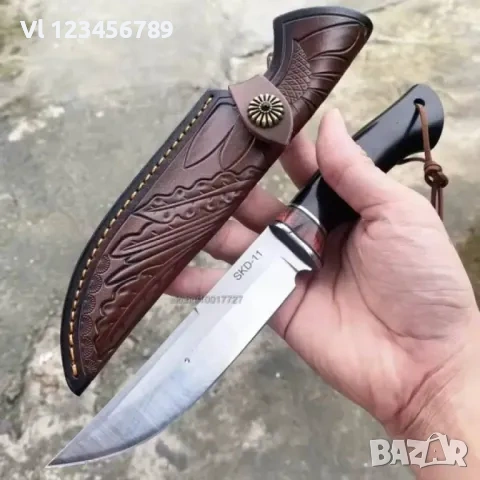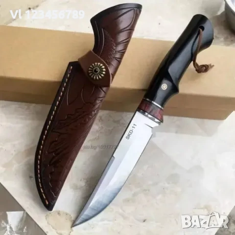 ловен нож HTWM-111 тип фултанг, дръжка-ценна дървесина, кания-кожа, художествено обработена