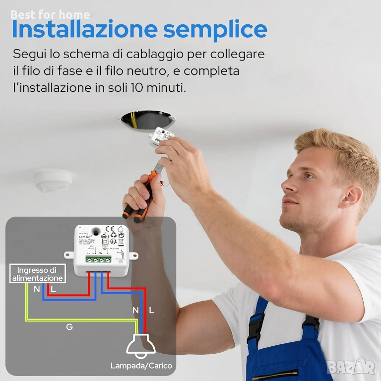 Повече избор от приложения от WiFi контакт за повърхностен и вграден монтаж. L може да контролира таванно осветление, панелна лампа, градинска помпа и др. LoraTap Wifi релето е много компактно и може да се използва в различни електрически конзоли.