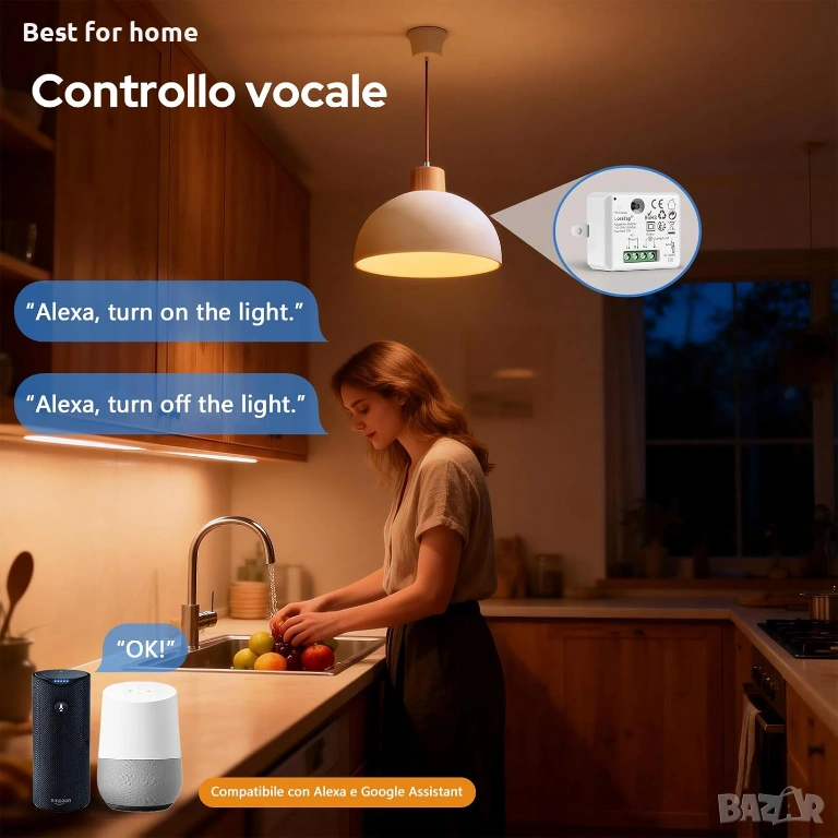 Гласово управление чрез Google Home и други интелигентни високоговорители. B. Включвайте или изключвайте коледните си светлини, телевизора, като просто докоснете вашия смартфон или използвате глас, без да се налага да ставате от дивана или апартамента и да се занимавате със скрити контакти.