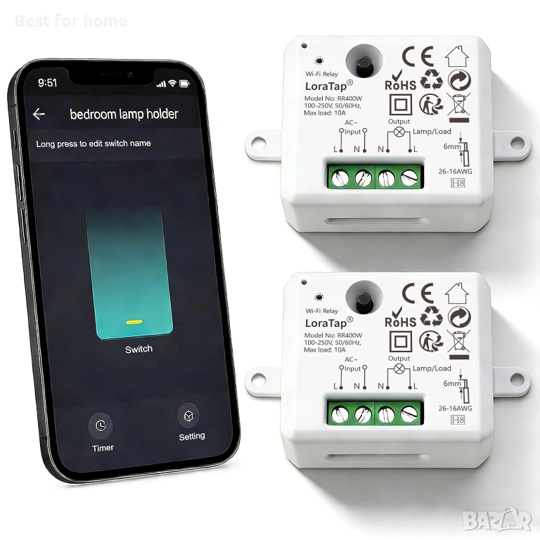 LoraTap WiFi интелигентен релеен модул, 2 броя, безжично дистанционно управление за включване/изключване с таймер и управление чрез приложение за телефон, работи с Google Home и Alexa Echo, 10A/2500W