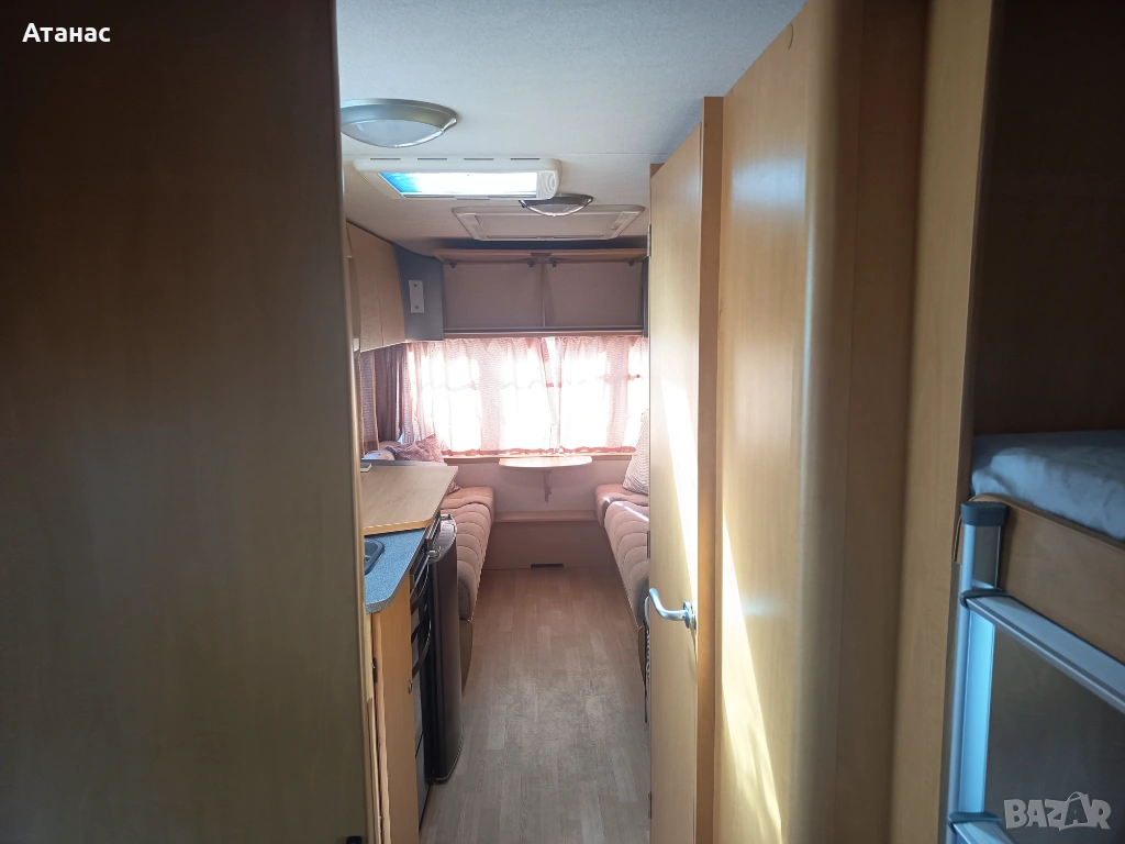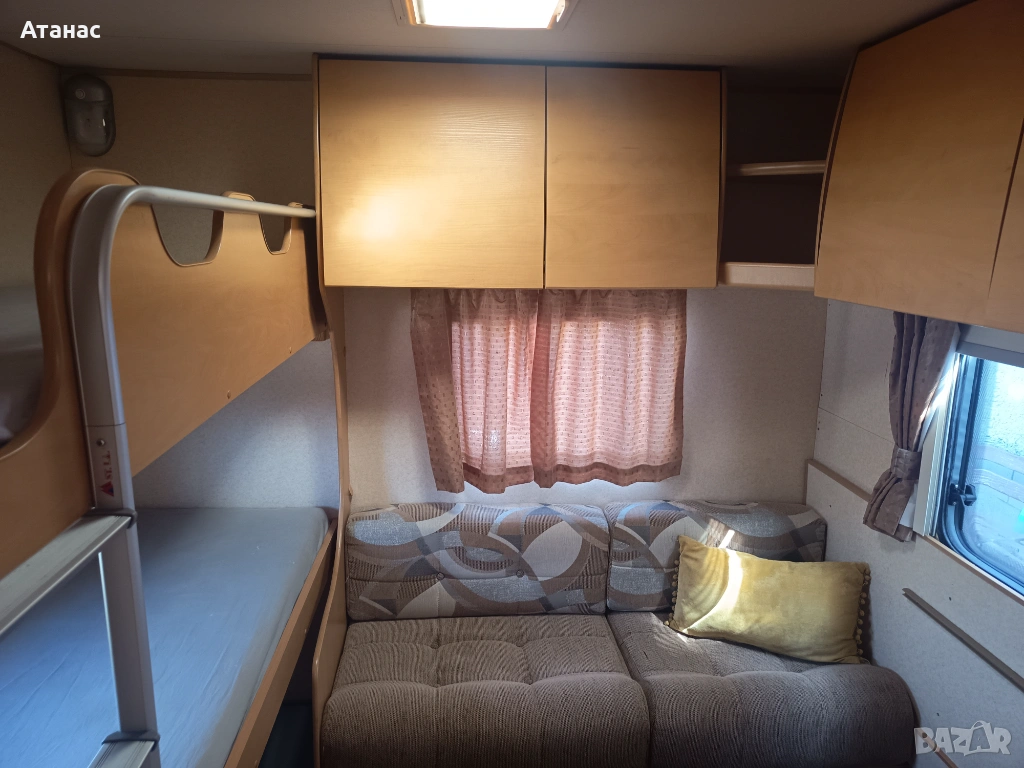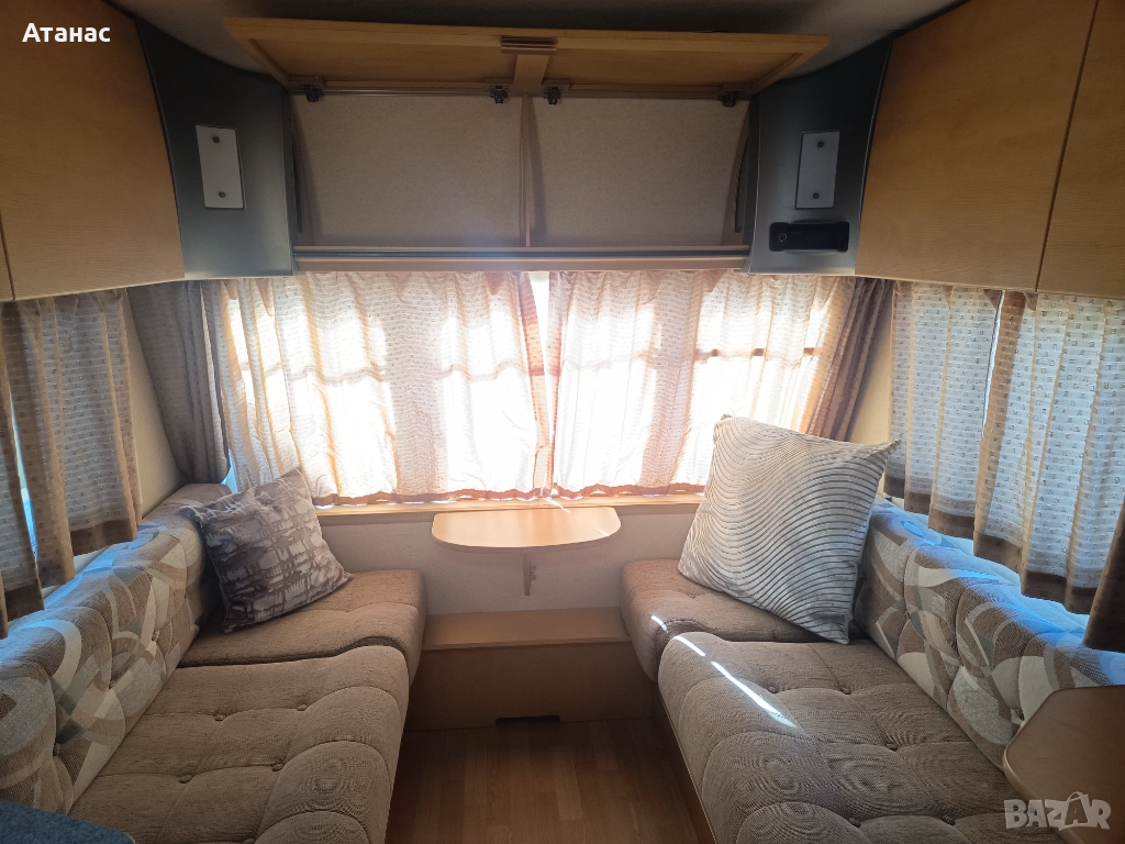 Страхотна чиста и спретната шест местна каравана. Без никакви течове, влага и мухъл. Разполага с форселт, резервна гума, газова бутилка, съдове за чиста и мръсна вода, кабел с евро букса, две маси, бойлер, печка, хладилник, радио, тонколони, като уредите работят на ток и газ. Панорамни прозорци с пердета, щори и комарници. Леглата са оборудвани с чисти матраци, чаршафи и възглавници, като едното е двуетажно. Почти нови гуми, здрави амортисьори и добър акумулатор. Чиста баня заедно с химическа тоалетна. Общо казано разполага с всичко необходимо за удобно къмпингуване. Дължина 5,40 м. /без теглич/, с теглич 6.00 м. Докарана на собствен ход. Съдействие за регистрация.