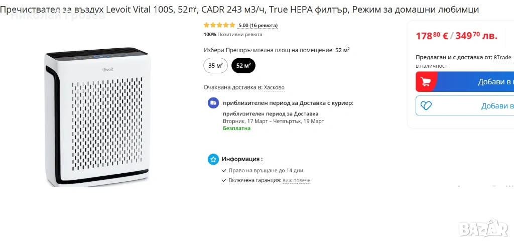 Създайте чиста и здравословна среда в дома си с пречиствателя за въздух Levoit Vital 100S. Със система за 3-степенна филтрация, интелигентно управление и широк U-образен въздуховод, който е особено ефективен за улавяне на пренасяната по въздуха козина от домашни любимци, този въздухопречиствател обединява удобството и чистотата.