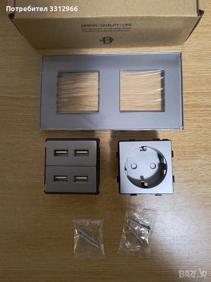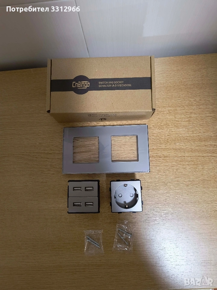 CNBINGO Стъклен вграден единичен Schuko контакт с 4 USB порта 2.4A със стъклена рамка, сив Спецификации: Щепсел Schuko с детска защита, поддържа AC 16A 250V макс. Входно напрежение на USB порта: 100V - 250V AC, 50/60Hz, USB изход: DC 5V/2.4A. Сертифициран по CE / RoHS