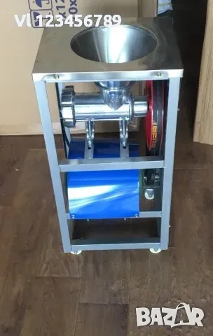 Алуминиева месомелачка №32 с колела, мелачка за месо с мотор и стойка, плот с фуния .