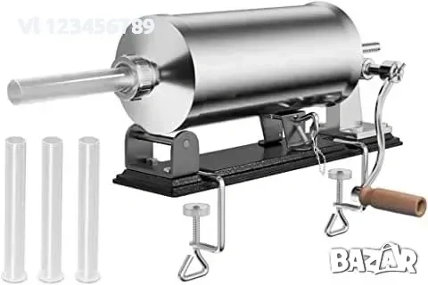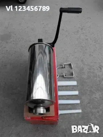 Пълначказа кайма, суджук, наденица, наденички и месо 4кг. Пълначка от н еръждаема стомана с 4 размера фунии. Механизма е изцяло метален, което прави продукта изключително здрав. За по-голямо удобство, пълначката е закрепена на допълнителна плоскост, а също така е оборудвана и със скоби за прихващане към маса или друг плот.