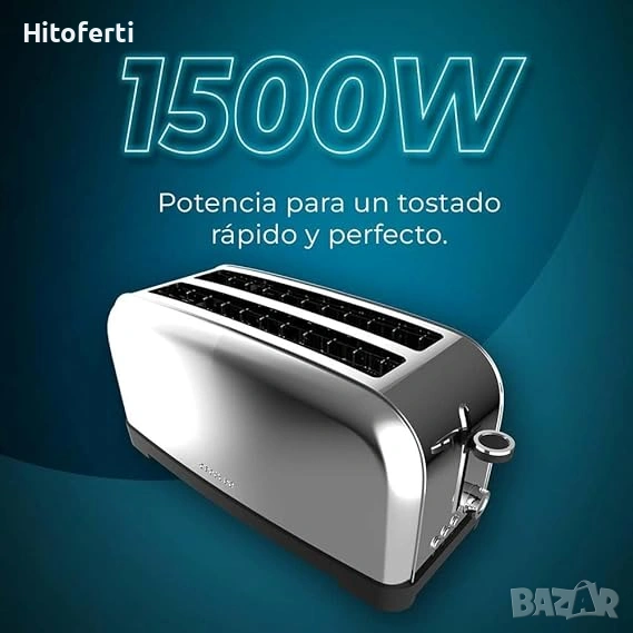 • Тостер с двоен дълъг отвор, мощност 1500 W и отвор с ширина 3,8 см за дебели хлябове.