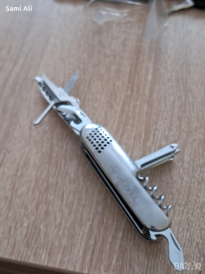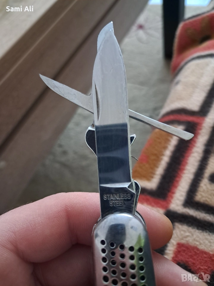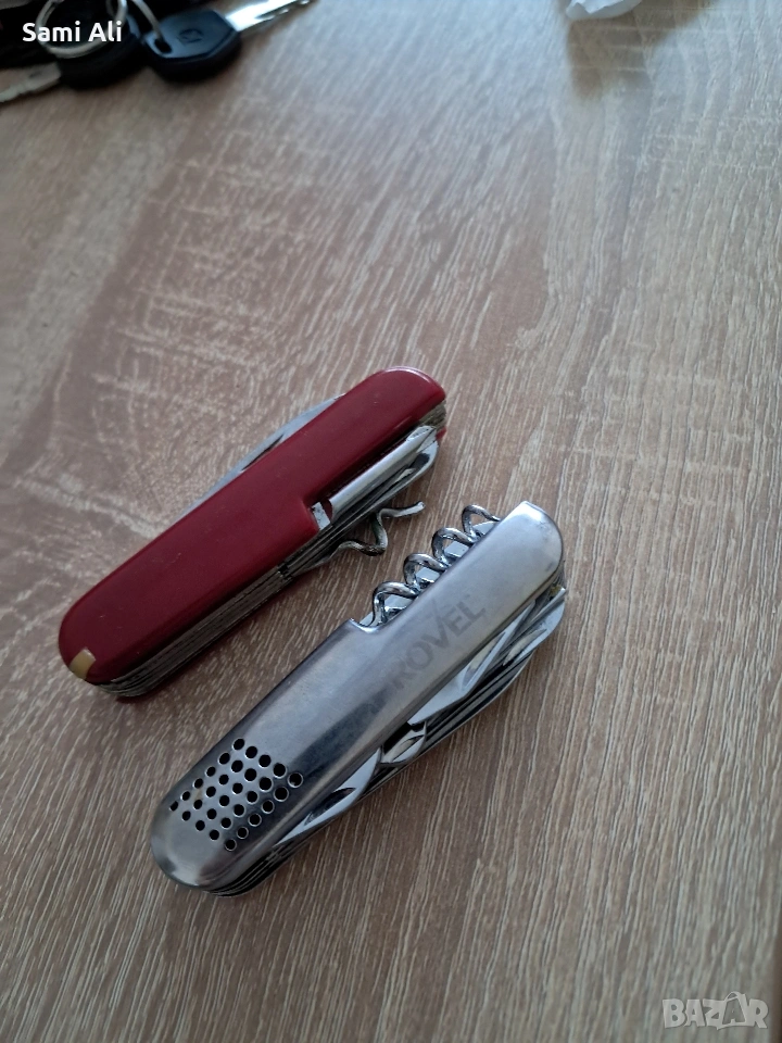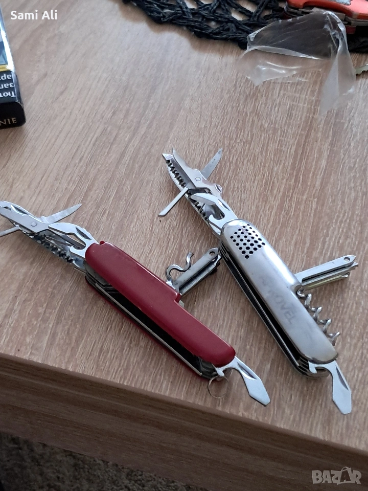 Червено ножче: Класически модел с основни инструменти (нож, отварачка, тирбушон и др.). ​Метално ножче: Здрав модел с допълнителни инструменти като клещи и кръстата отвертка. ​Състояние: Използвани, но напълно функционални. Остриетата са здрави. ​Материал: Неръждаема стомана