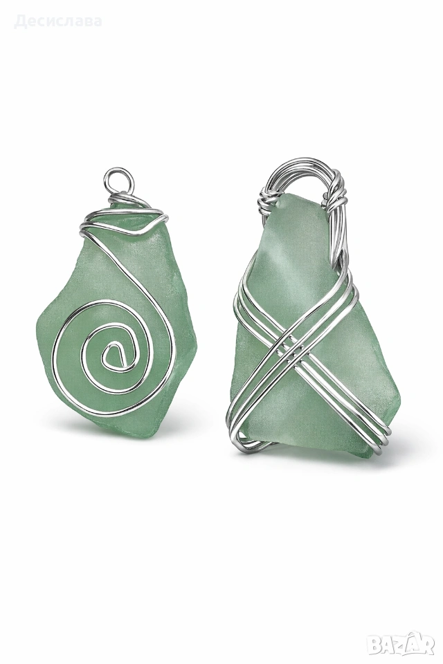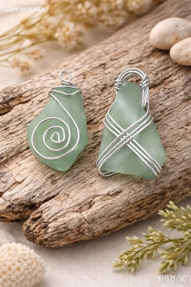 „🌊 Уникален комплект ръчно изработени висулки от морско стъкло, увити в сребърна тел.