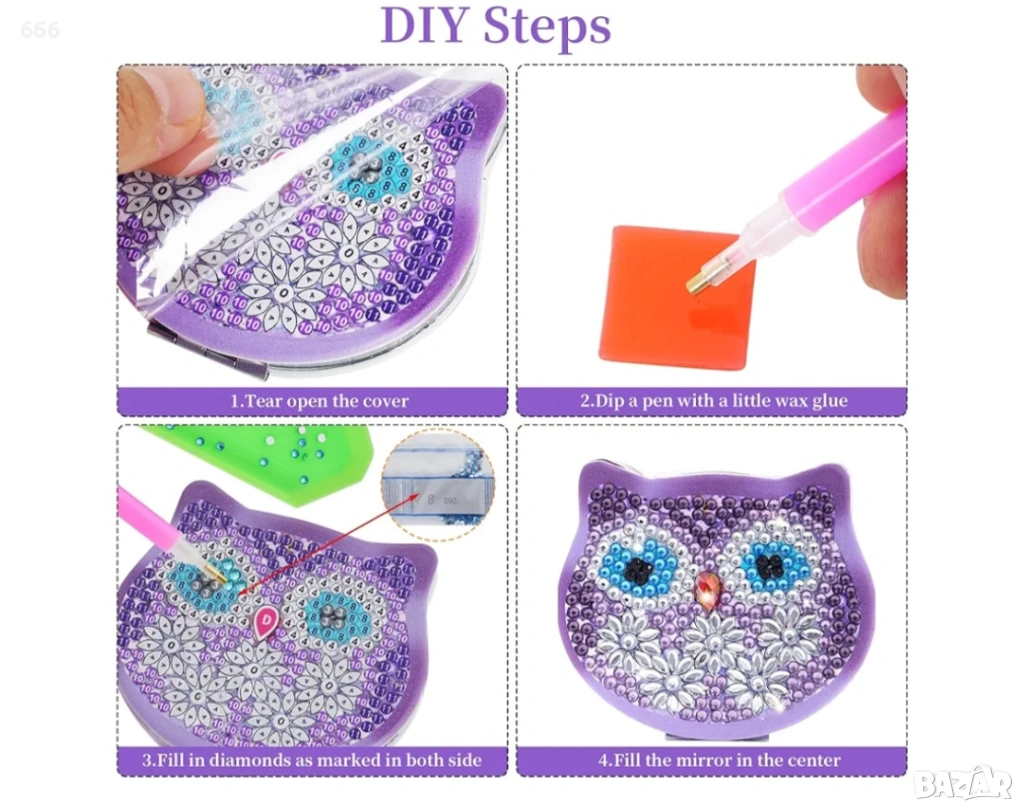 Направи си сам огледала с диамантена боя с множество цветови възможности: Тези джобни огледала са проектирани в гама от цветове, което ви позволява да изберете любимия си и добавя нотка сладост за тези, които ценят красивите неща. След като бъдат направени, можете да ги подарите на семейството или приятелите си или да ги запазите за ежедневна употреба.