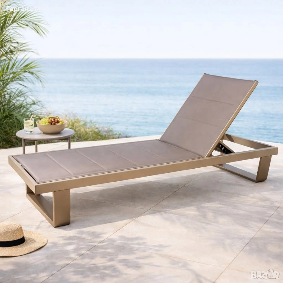 шезлонг алуминий – регулируем, 197×62×33 см Създайте комфортна зона за релакс с този алуминиев градински шезлонг, който съчетава модерен дизайн, стабилна конструкция и удобство при използване. Благодарение на регулируемата облегалка можете лесно да настроите позицията според вашите предпочитания – за четене, почивка или слънчеви бани. Конструкцията е изработена от алуминиева рамка с прахово боядисано покритие, което осигурява устойчивост на корозия, атмосферни влияния и дълготрайна употреба. Седалката е изработена от текстилен плат, който позволява добра циркулация на въздуха и комфорт дори при горещо време. Стилният минималистичен дизайн и неутралният цвят го правят лесен за съчетаване с различни градински мебели и интериор на открито. Шезлонгът е подходящ както за домашна употреба, така и за хотели, басейни и ваканционни комплекси. Предимства Регулируема облегалка за по-голям комфорт Лека и здрава алуминиева конструкция Устойчив на атмосферни условия Дишащ текстилен плат Модерен и елегантен дизайн Подходящ за градина, двор, басейн и тераса Характеристики Тип: Градински шезлонг Материал рамка: Алуминий Материал седалка: Текстилен плат Повърхност: Прахово боядисана Размери: Дължина: 197 см Ширина: 62 см Височина: 33 см Цвят: Бежов / пясъчен Приложение: Градина, тераса, басейн, плаж Доставка до 3 дни с преглед и тест