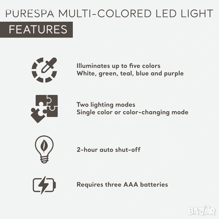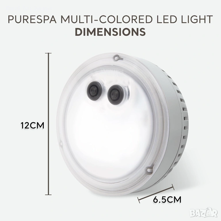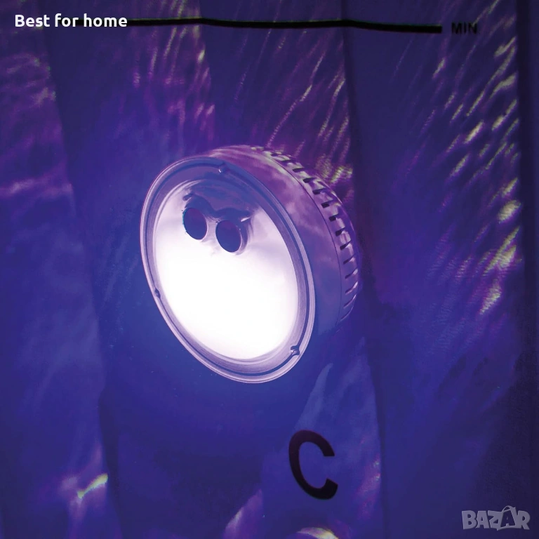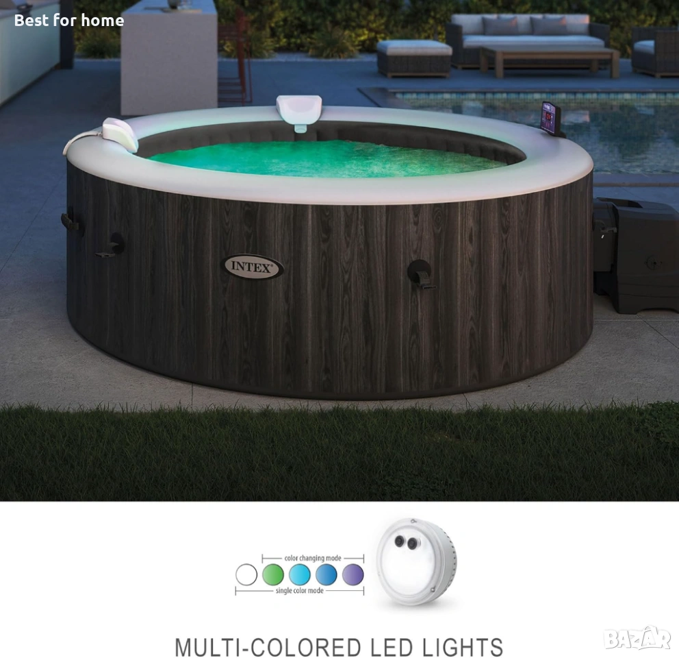 Intex PureSpa Потопяема многоцветна LED светлина с батерии, модели PureSpa с бяла, зелена, тюркоазена, синя и лилава светлина.