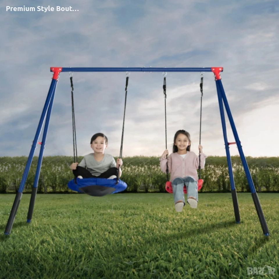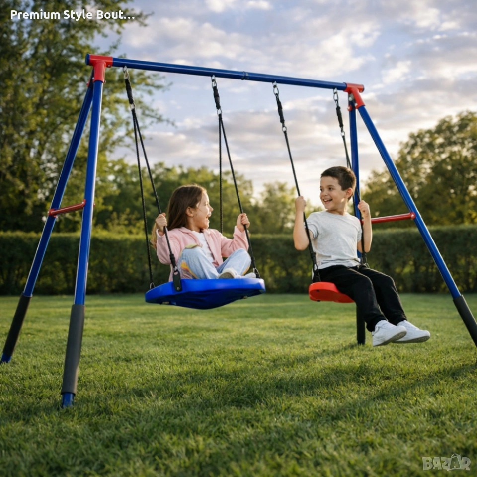 Технически характеристики на Комплект от 2 метални люлки FunZone - безкрайно забавление на двора Размери на основата: 109,4” Ш x 54” Д x 68,9” В Диаметър на люлка тип чинийка: 23,6” Материал: прахово боядисана стомана (2-инчови тръби), формована пластмаса и здрави въжета Капацитет: общо до 200 lb (около 90 кг), по 100 lb на елемент Препоръчителна възраст: 3+ години Включва: 4 заземителни колчета, подплънки от пяна за краката, регулируеми закрепвания Стандарти: отговаря или надвишава изискванията за безопасност ASTM за жилищни детски площадки доставка с Еконт с опция преглед до 3 работни дни.
