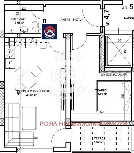 - Разпределение: удобна дневна с място за кухненски бокс и трапезария, самостоятелна спалня, баня с тоалетна, тераса за приятно сутрешно кафе.