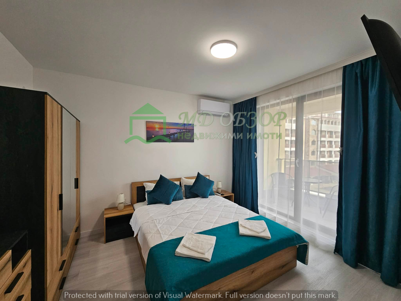 Предлагаме Ви за продажба напълно обзаведен нов тристаен апартамент с чиста площ 74.48кв.м. в съвременна луксозна сграда с акт 16, само на 250м. от морето в най-предпочитания квартал за туризъм на красивия черноморски курорт. Разстоянието до търговските улици е само 200м. Апартамента е с изложение изток - запад. Състои се от входно антре, всекидневна с кухненски тракт, преходна спалня с тераса с източно изложение /частична гледка към морето/, втора спалня /непреходна/ с тераса на запад с прекрасна панорама към планината и санитарен възел. Във всяка стая е монтиран климатик ; настилки: теракота във всекидневната и ламиниран паркет в спалните. Сградата разполага с модерен асансьор, малък басейн и летен кът за почивка. Осигурено е целогодишно почистване и поддръжка. Таксата за поддръжка за всички апартаменти в сградата е 5 евро на кв.м. за година. Към момента няма свободни паркоместа за закупуване.
