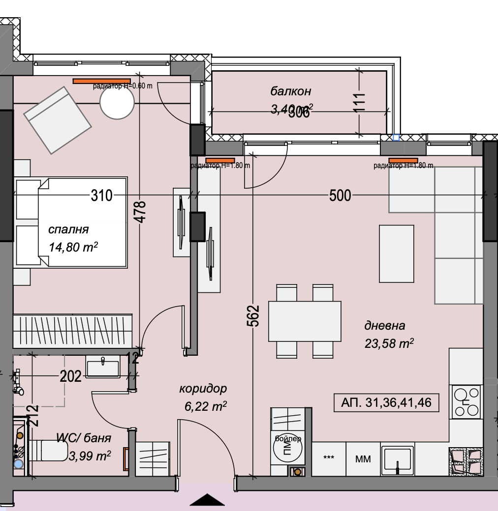 Отопление и топла вода на ТЕЦ. Предвидили сме изводи за климатик и място за бойлер във всеки апартамент.