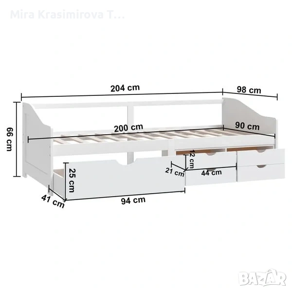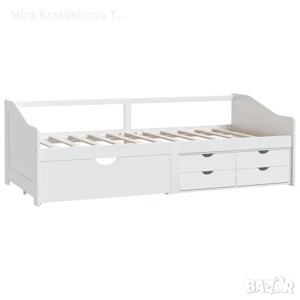 Бяло 3-местно дневно легло (кушетка) с чекмеджета за съхранение. Направено от бор - масив, размери 90х200 см. Многофункционалното дървено легло може да се използва като диван през деня и като много удобно легло през нощта. Това практично легло-кушетка е изработено от масивна борова дървесина, което го прави здраво и стабилно. Здравите ламели също предлагат необходимата опора и комфорт. Освен това леглото включва и 5 чекмеджета за съхранение на дрехи, играчки и др. Матракът се купува отделно. Продавам и матракът на цена 250 EUR. Матракът е почти нов (той и леглото са използвани 2 дни), двулицев, много висок клас. При интерес ще изпратя информация и за него. Спецификации на леглото: • Цвят: Бял • Материал: Масивна борова дървесина • Общи размери: 204 x 98 x 66 см (Д х Ш х В) • Размери на чекмеджето (голямо): 94 x 41 x 25 cм (Ш x Д x В) • Размери на чекмеджето (малко): 44 x 21 x 12 см (Ш x Д x В) • Височина за спане от земята: 34 см • Може да служи както като легло за гости, така и като диван • Размери на подходящ матрак: 90 x 200 см (Ш x Д) (матракът не е включен) • Голямото чекмедже разполага с колелца