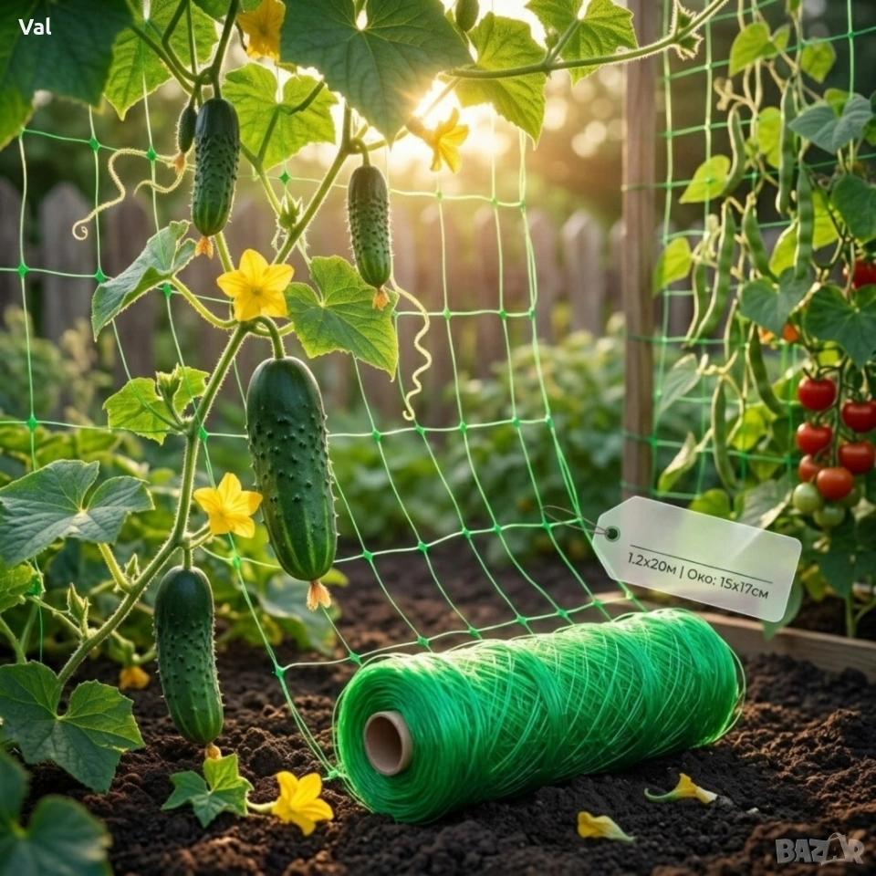 мрежа: 1,2 x 20 м — покрива големи площи и е подходяща за редици растения. Размер на окото: 15 x 17 см (около 14,5 x 15 см според спецификация) — оптимално за увивни стъбла и плодове. Материал: устойчив полимер, устойчив на UV и атмосферни влияния. Цвят: зелен — съчетава се с растителността и не привлича излишно внимание. Висока якост на опън — не се деформира под тежестта на реколтата. Подходяща за: краставици, боб, домати, тиквички, пълзящи цветя, тераси и вертикални градини.
