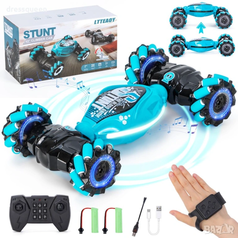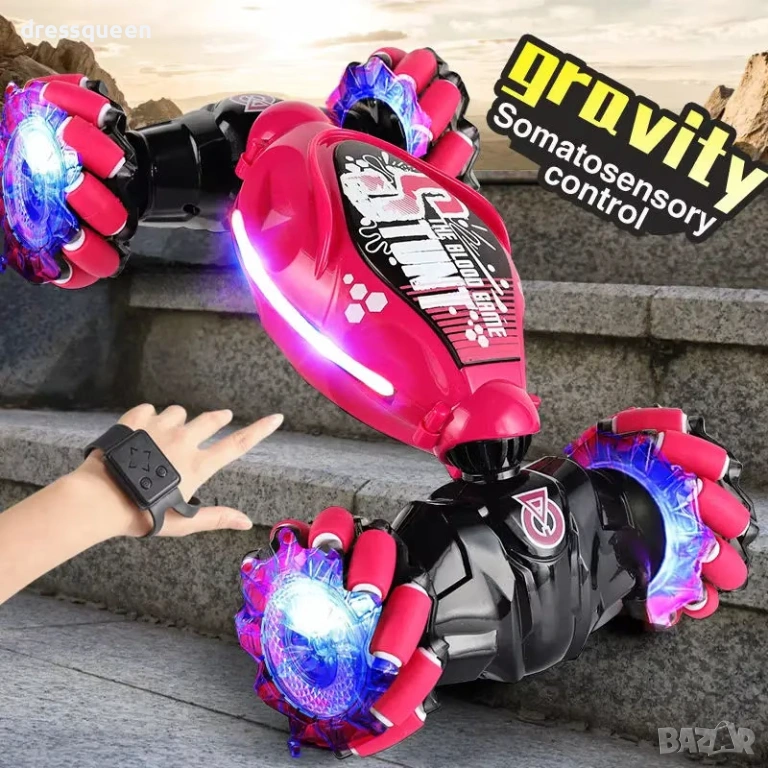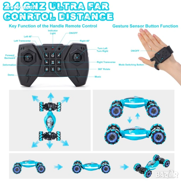 Тази невероятна Трансформираща 4WD Stunt Car предлага двойно управление – можете да контролирате всяко движение чрез сензорна гривна за жестове или чрез стандартно 2.4 GHz дистанционно.