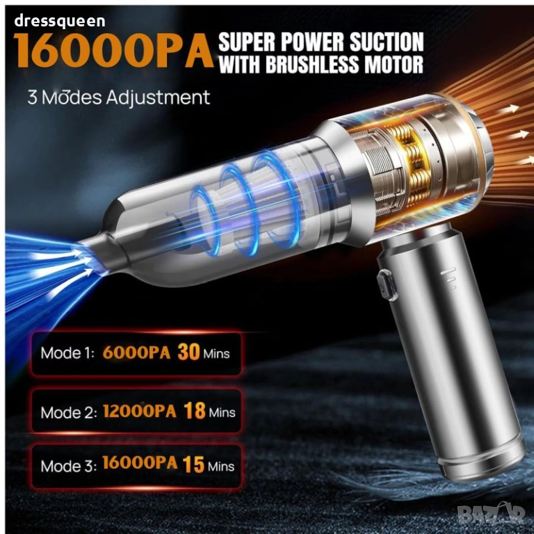 16000PA Сила: Осигурява максимална мощност, необходима за справяне с всякакви замърсявания в колата.