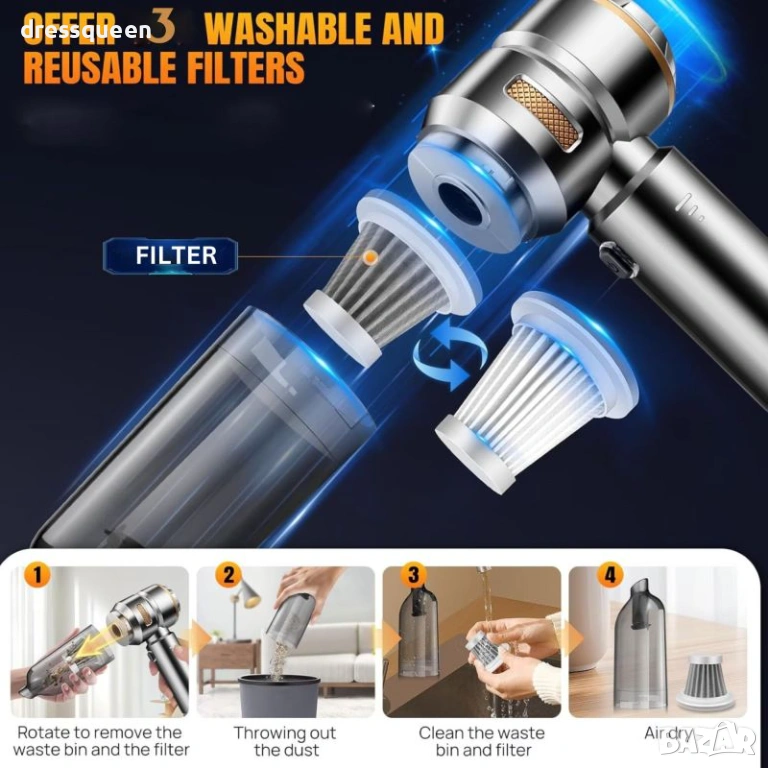 Проектирана с акцент върху безжична свобода, тази прахосмукачка за кола 16000PA не само засмуква, но разполага и с полезна функция издухване , която е идеална за почистване на прах от труднодостъпни места като вентилационни отвори.