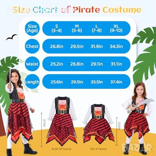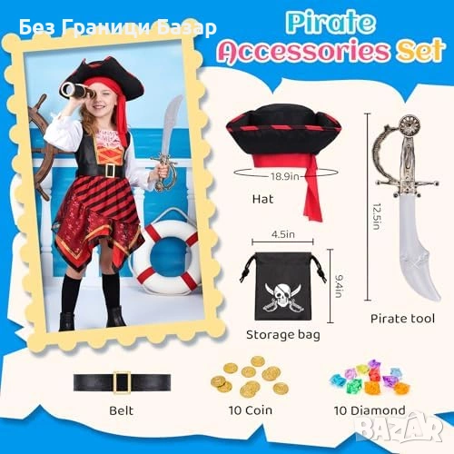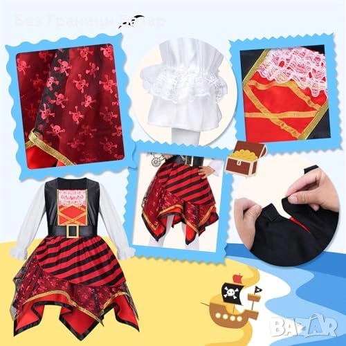 Детски пиратски костюм с рокля, пиратска шапка, колан и меч