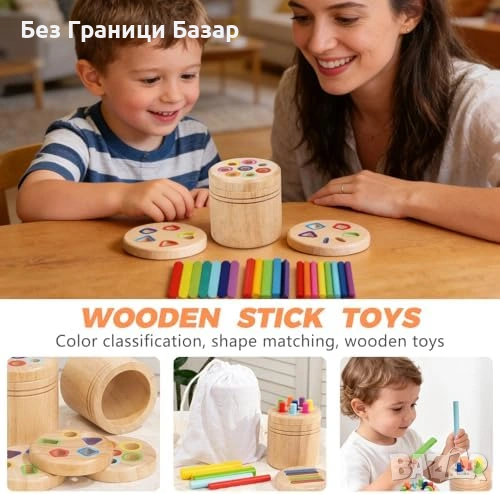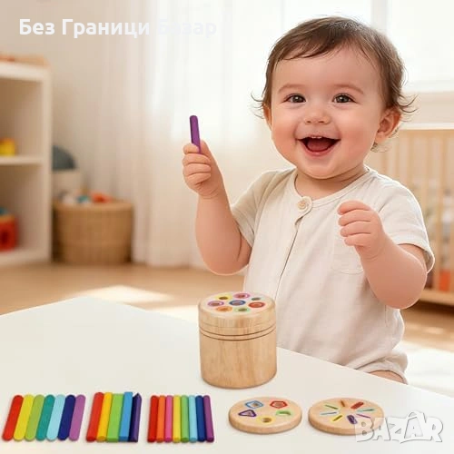 Съчетава сортиране по цвят, съчетаване на форми и моторни упражнения